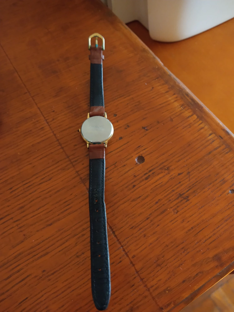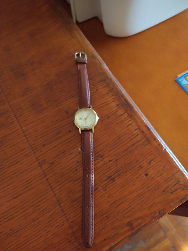 Gold tone watch with a brown leather band. Runs but may need a new battery. Small watch face, approximately 1 inch in diameter.