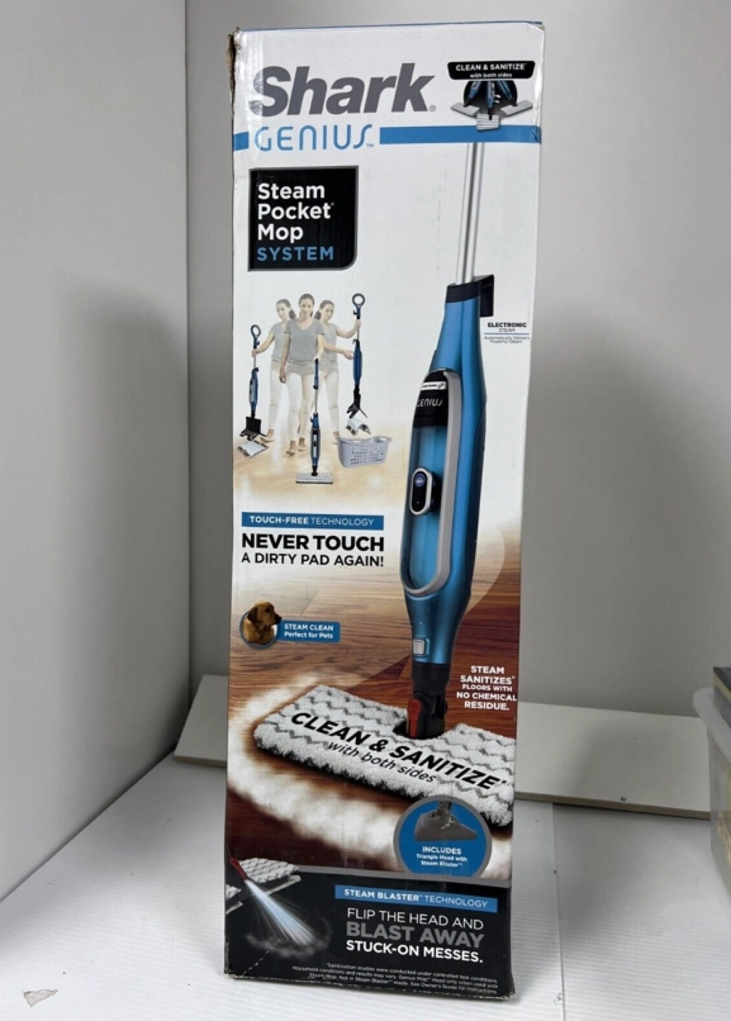 Steam Pocket Mop System, blue and grey in color, includes a triangle head with Steam Blaster. Never touch a dirty pad again! Cleans and sanitizes floors with no chemical residue.