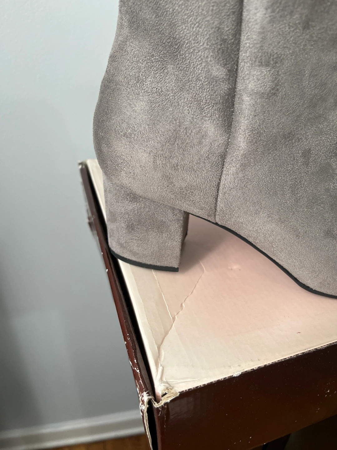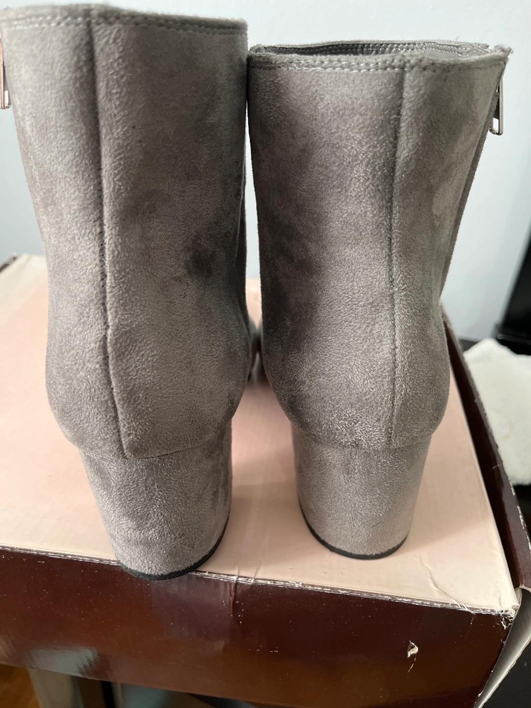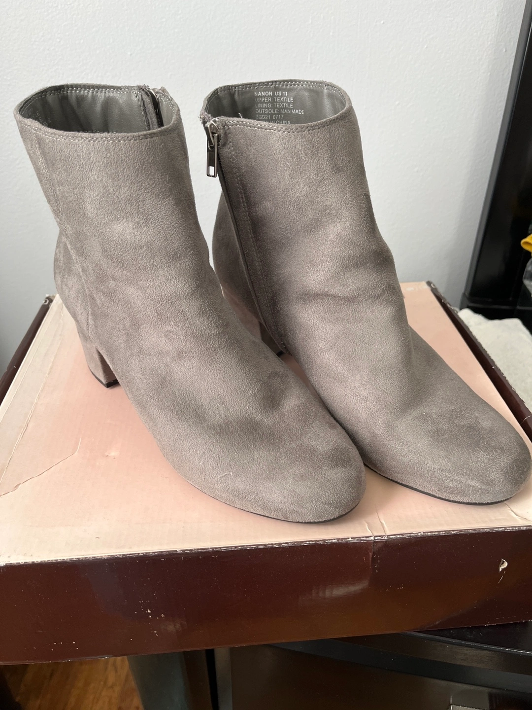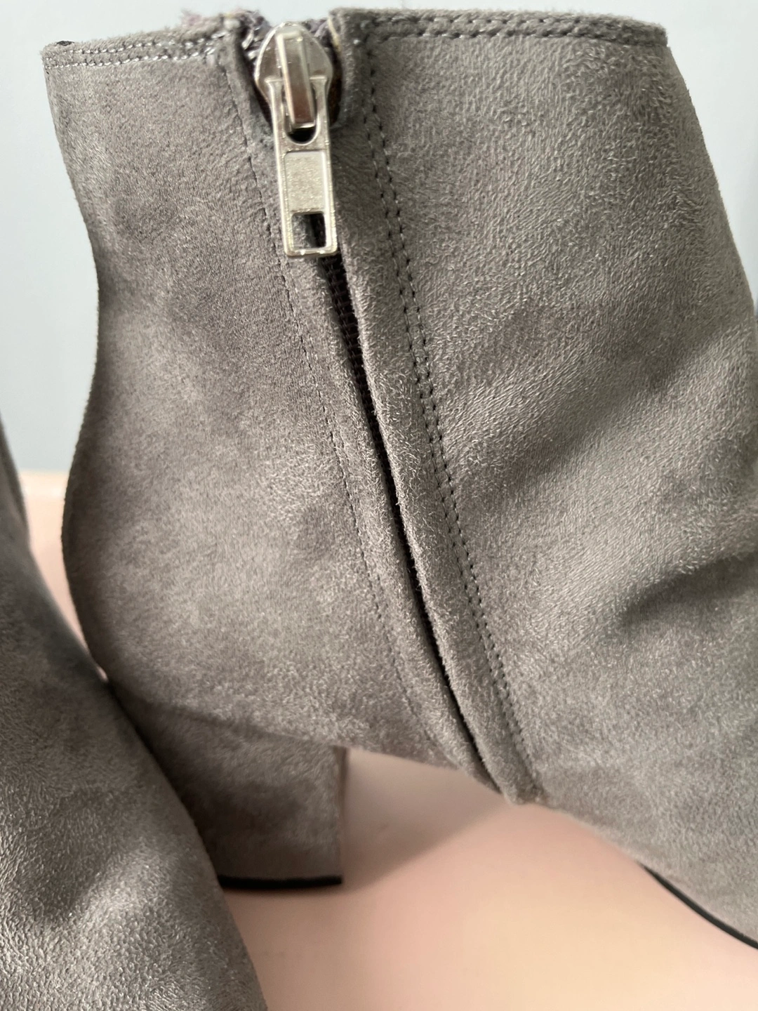 76Grey suede booties with a block heel. Size 11. These are brand new with a 2 inch block heel. Has rubber sole for added comfort. Round toe very comfortable. Located on 91 street and 34 avenue pickup not available from 11-4 to 11-18