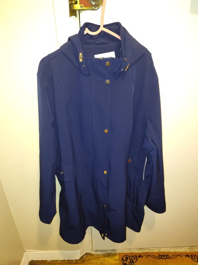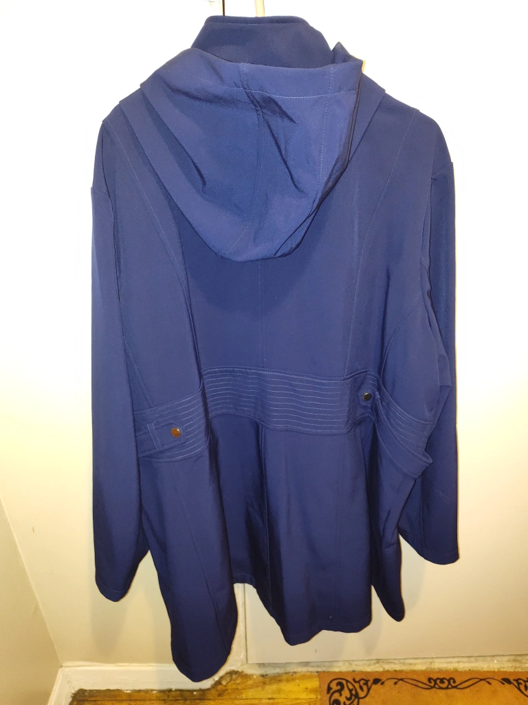 135Navy blue jacket with a hood. Snap closure. Long sleeves. Two pockets.