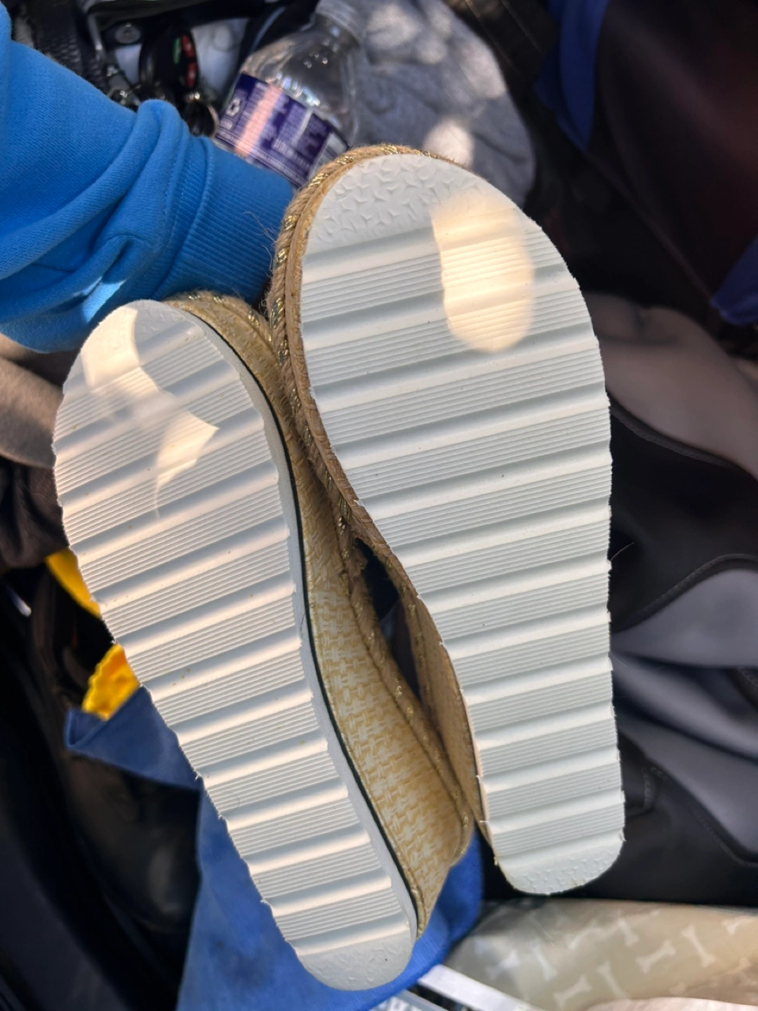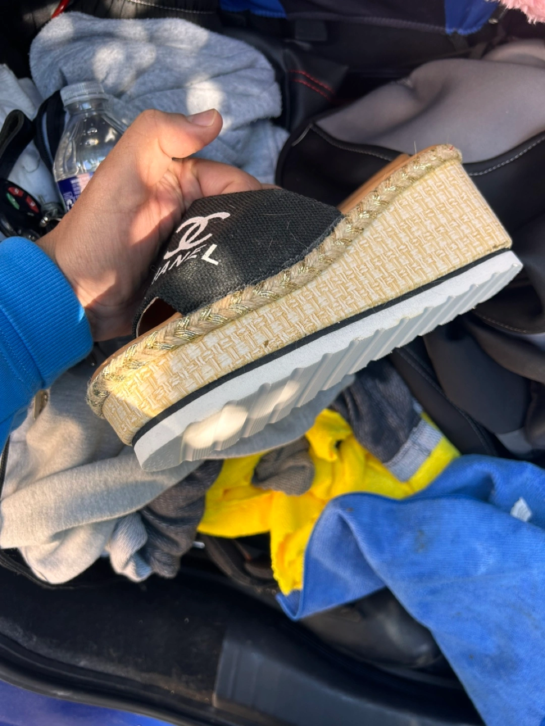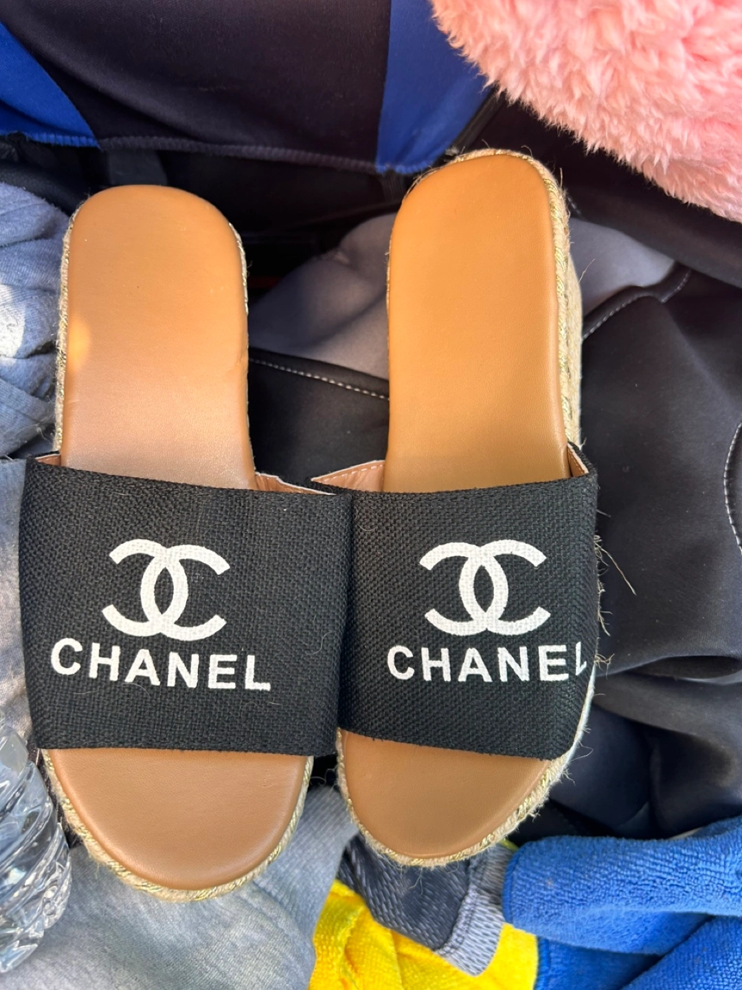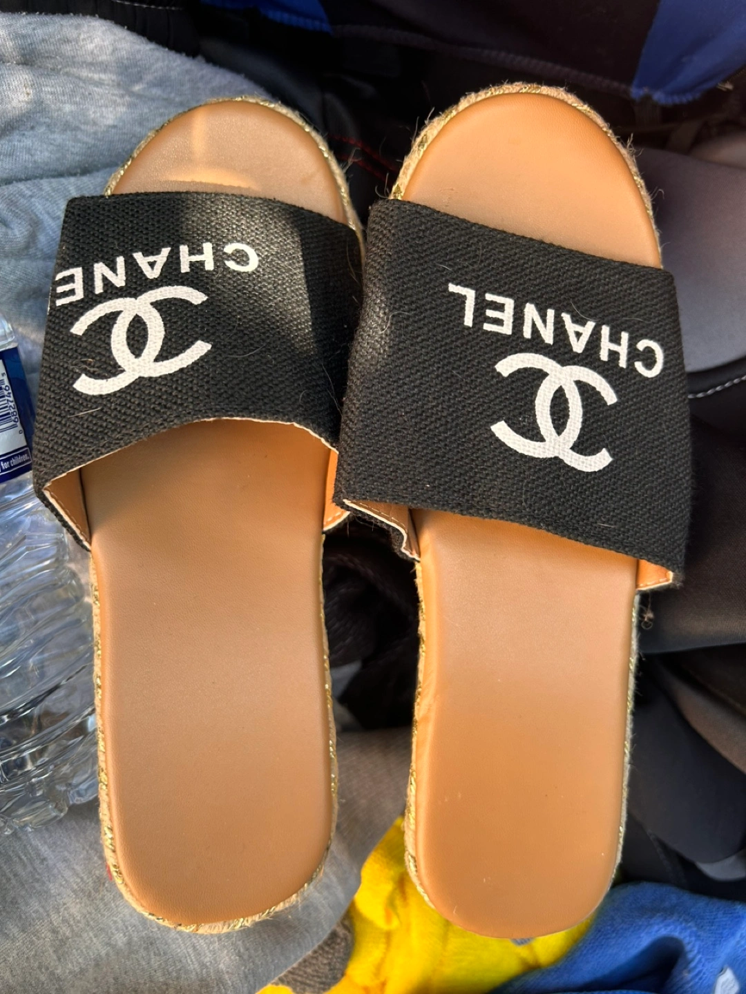 234Black slides with white Chanel logo. Platform sole with a woven design.