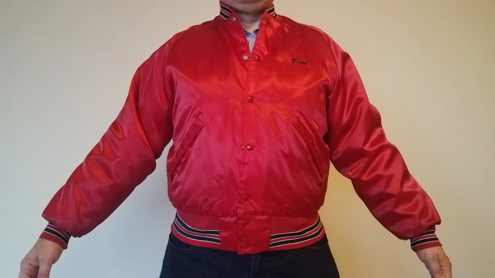 Red satin bomber jacket with name Frank and design on the back. Black and white stripe trim on the sleeves and bottom. Snap button closure.