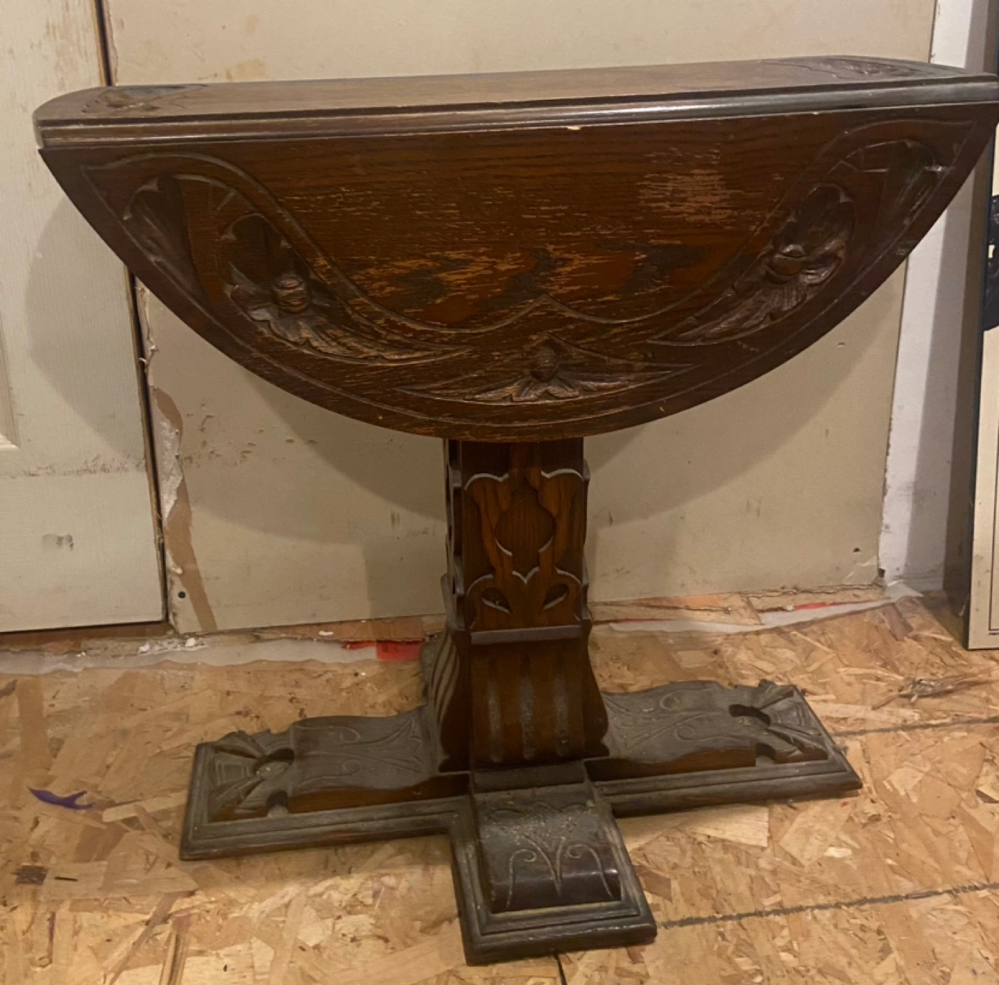 Solid Oak side table. Features a drop leaf design. Lift leafs, turn and you have solid round table. Needs a little TLC, and a good clean, but in great condition