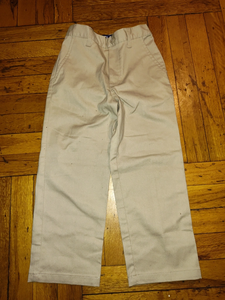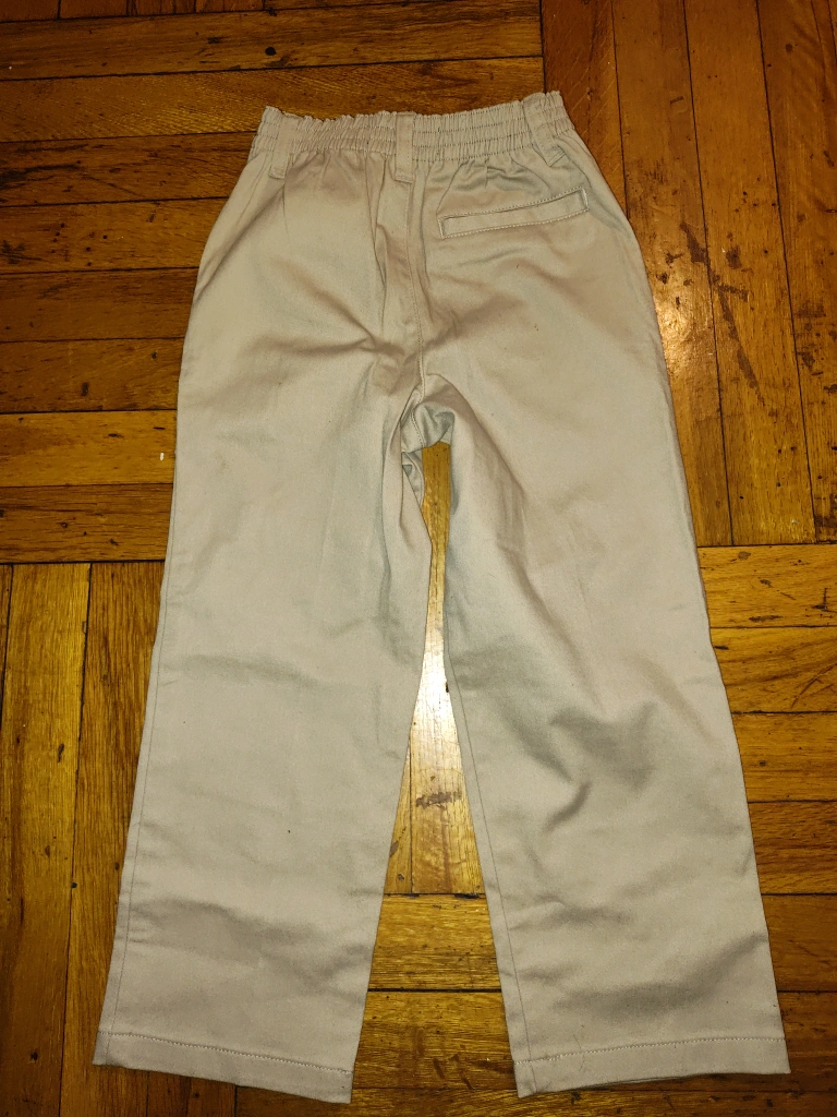 135Khaki pants with elastic waistband and a button closure. Two front pockets and one back pocket. Great for school or casual wear.