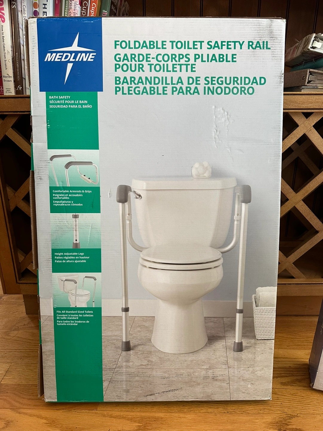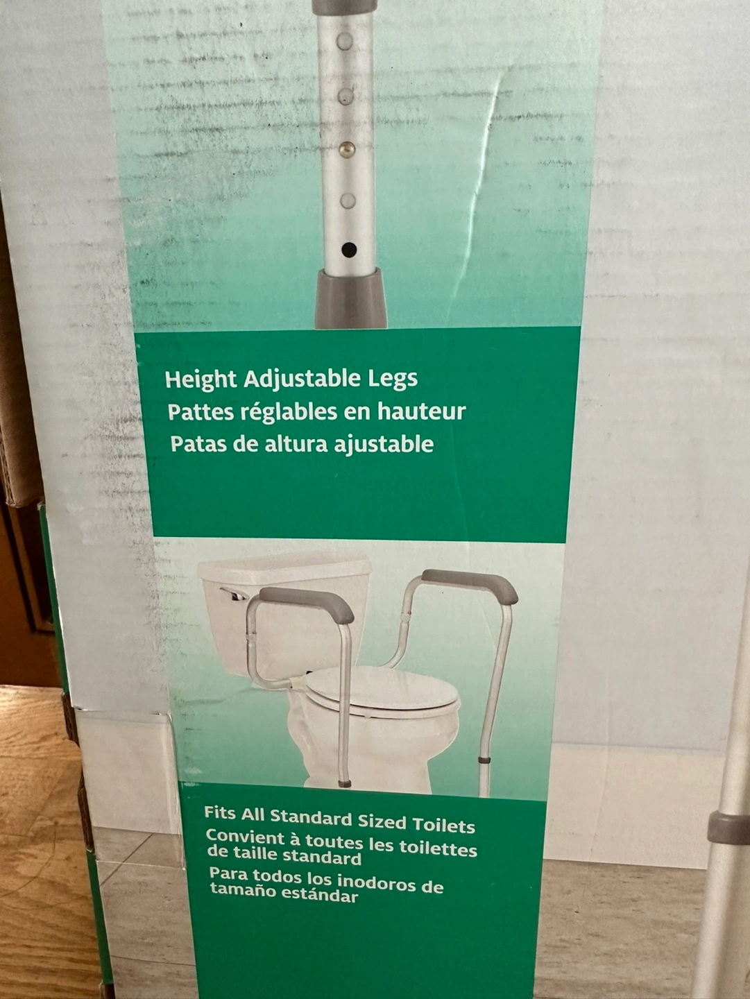 Foldable toilet safety rail. Height adjustable legs. Fits all standard sized toilets. New in box . Bought from Amazon for $50.