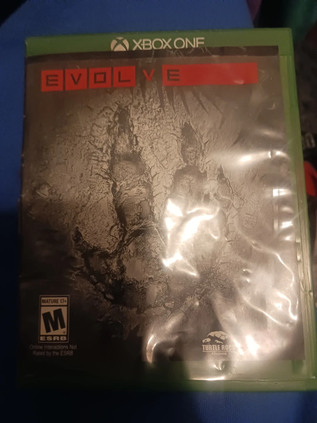 Selling the game Evolve for Xbox One. It's rated M for Mature 17+ by the ESRB. Online interactions are not rated by the ESRB. Developed by Turtle Rock Studios