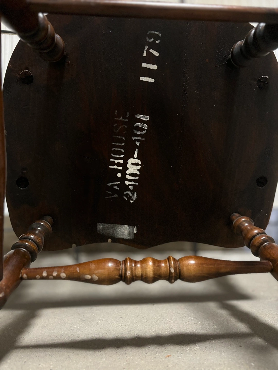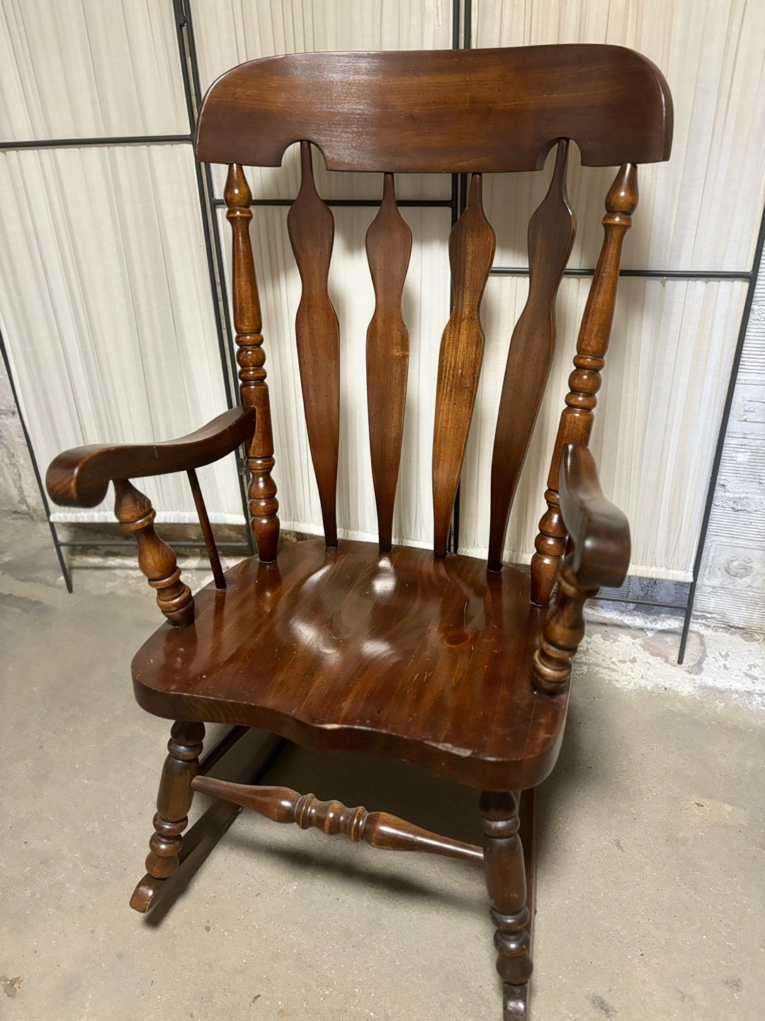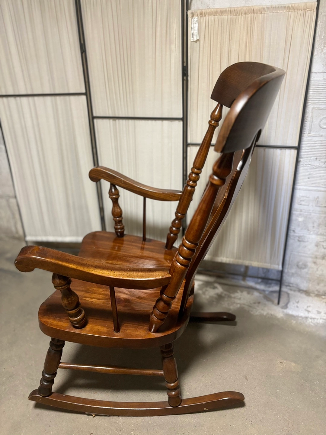 91Wooden rocking chair with turned spindles. The chair is dark brown with a natural wood finish. It has a slightly curved back and gently curved arms. The chair appears to be in good condition.