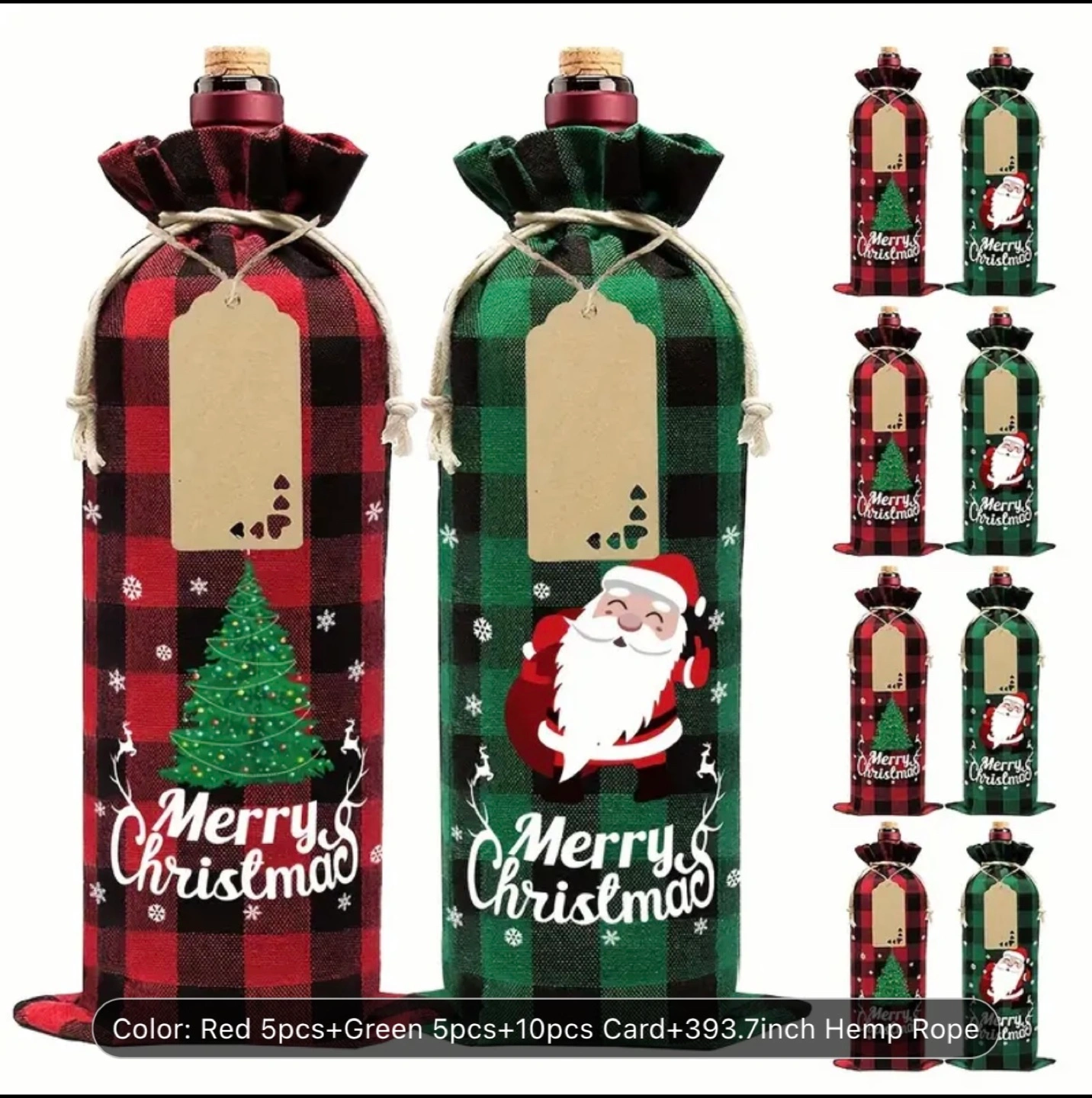 Set of 10 Christmas wine bottle gift bags. Includes 5 red and 5 green plaid bags with Santa and Christmas tree designs, 10 blank gift tags, and 393.7 inches of hemp rope and free 10 Christmas stickers to complete your wine gift.