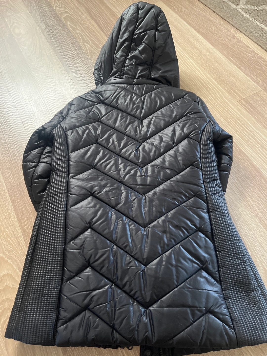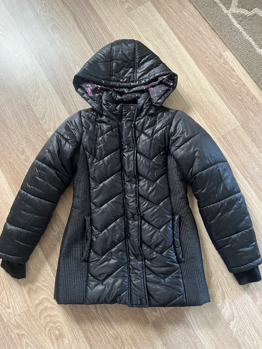 Black puffer jacket with a hood. Features a chevron quilted design. No rips or stains. Has a zipper and snap closure. Size 8/10.