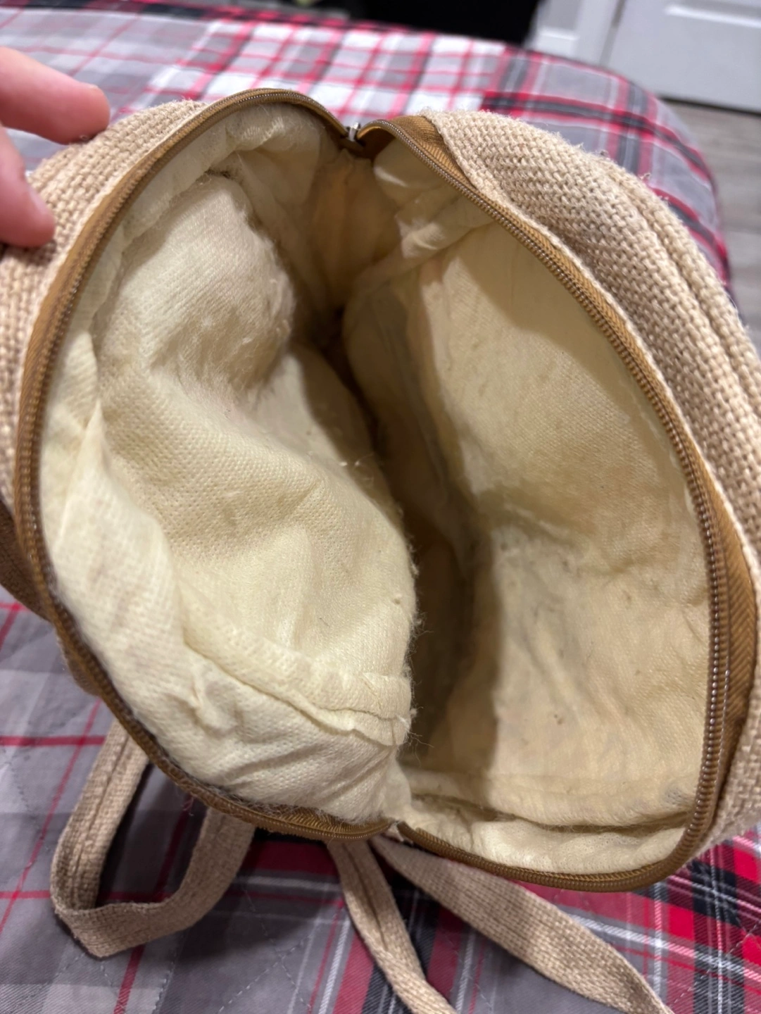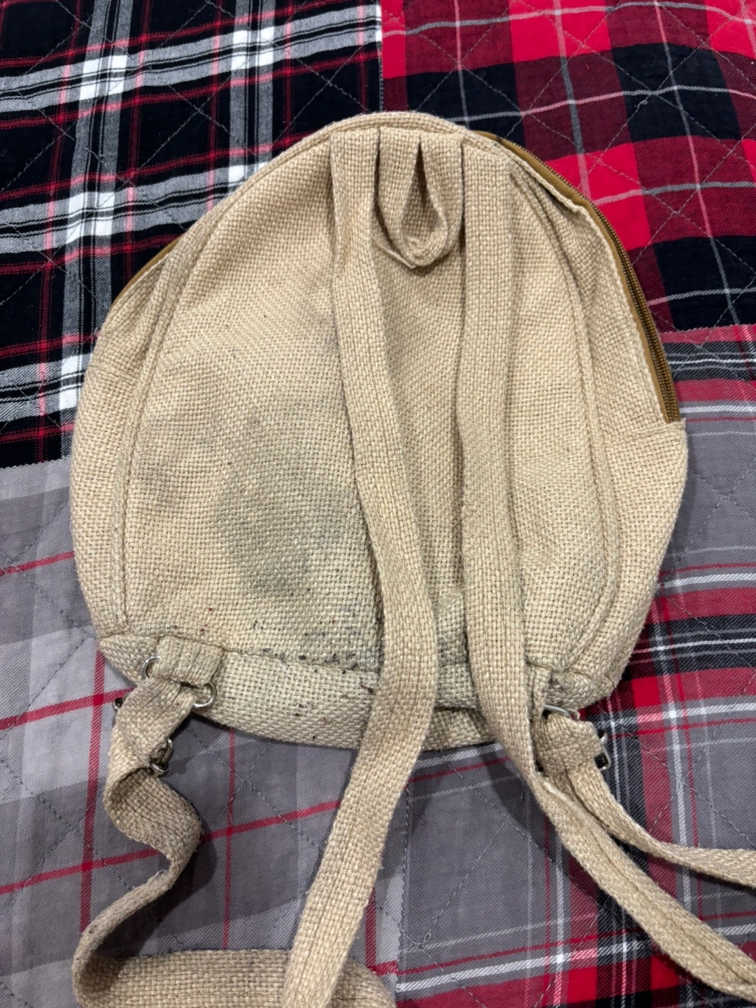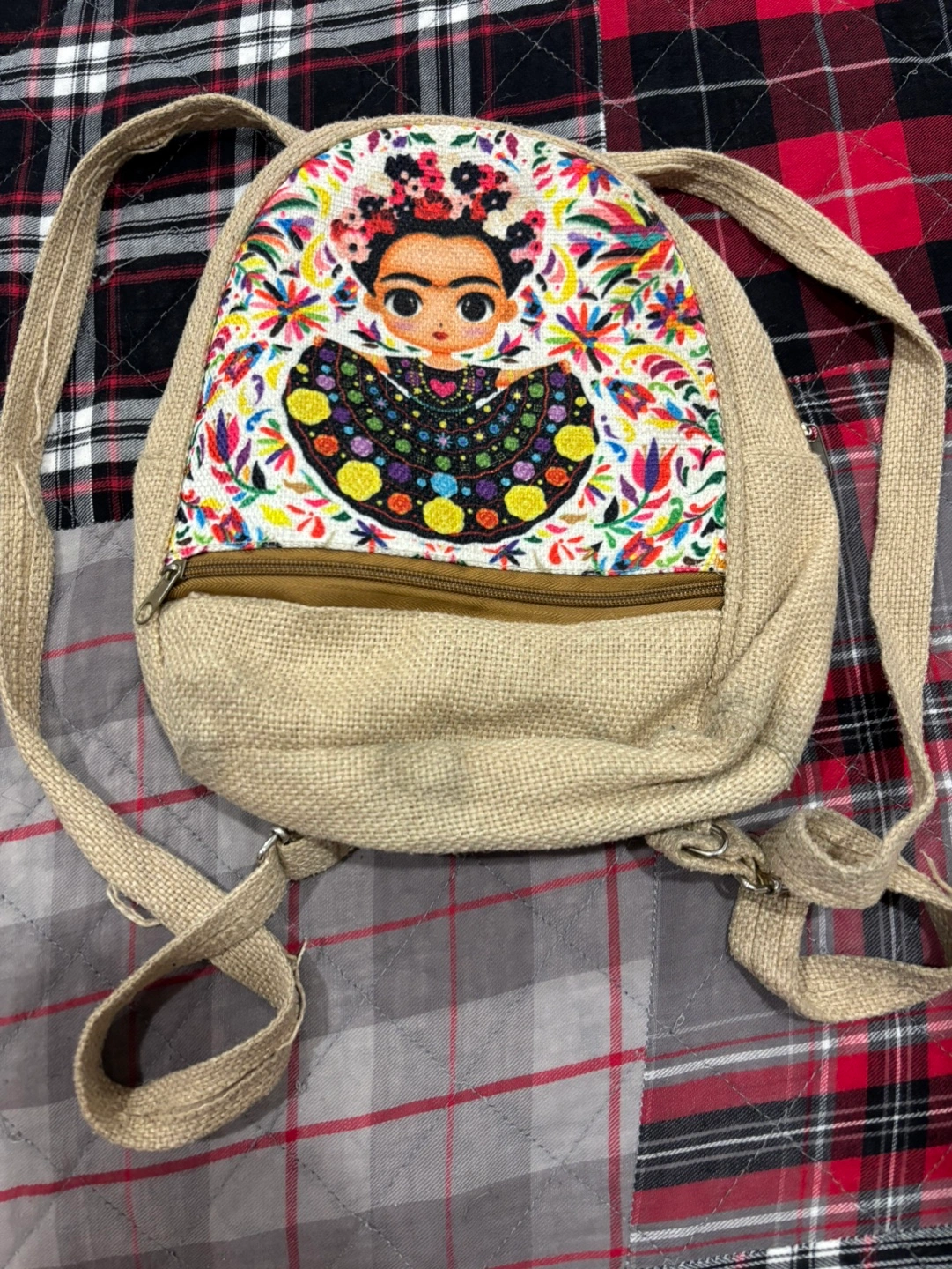 Small hemp backpack featuring Frida Kahlo. Has one zippered pocket on the front. Adjustable straps. From Mexico.