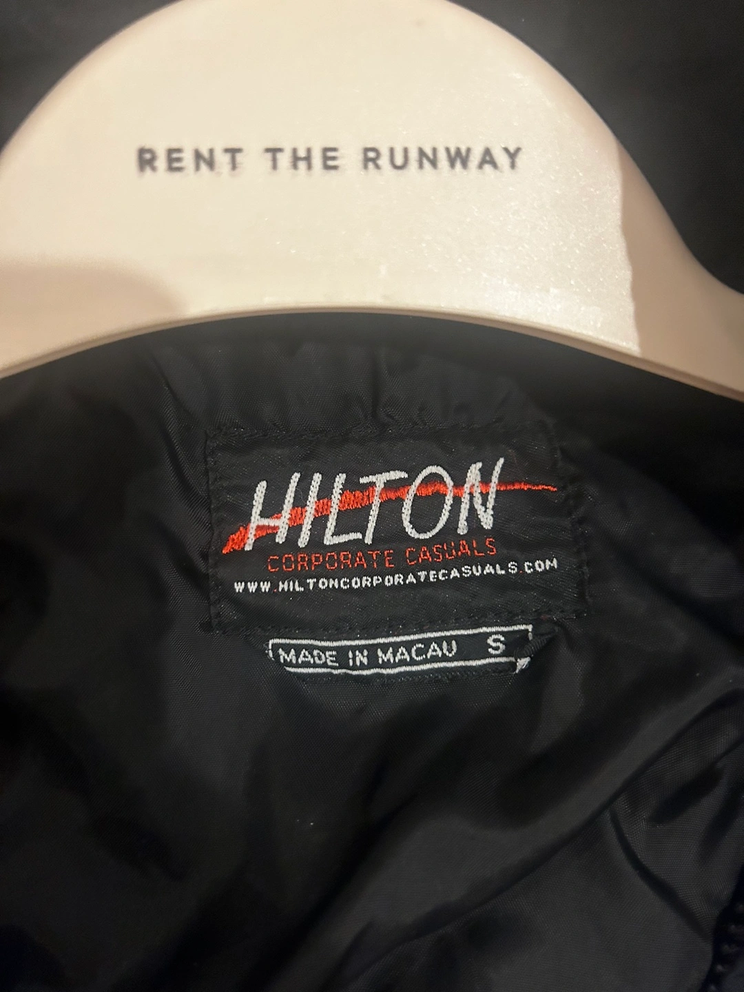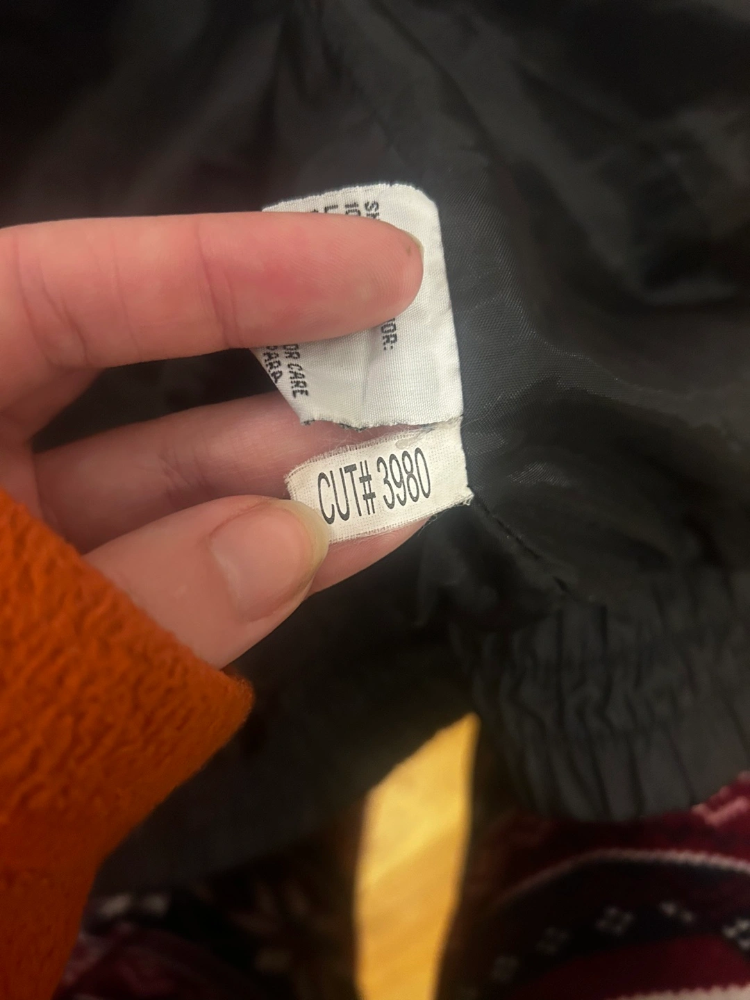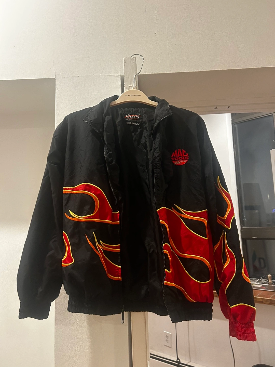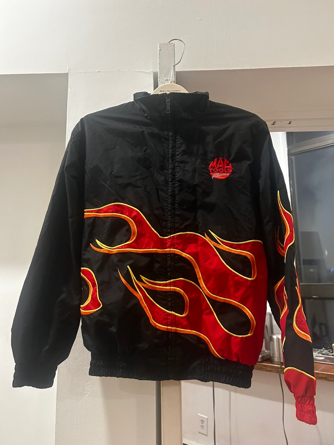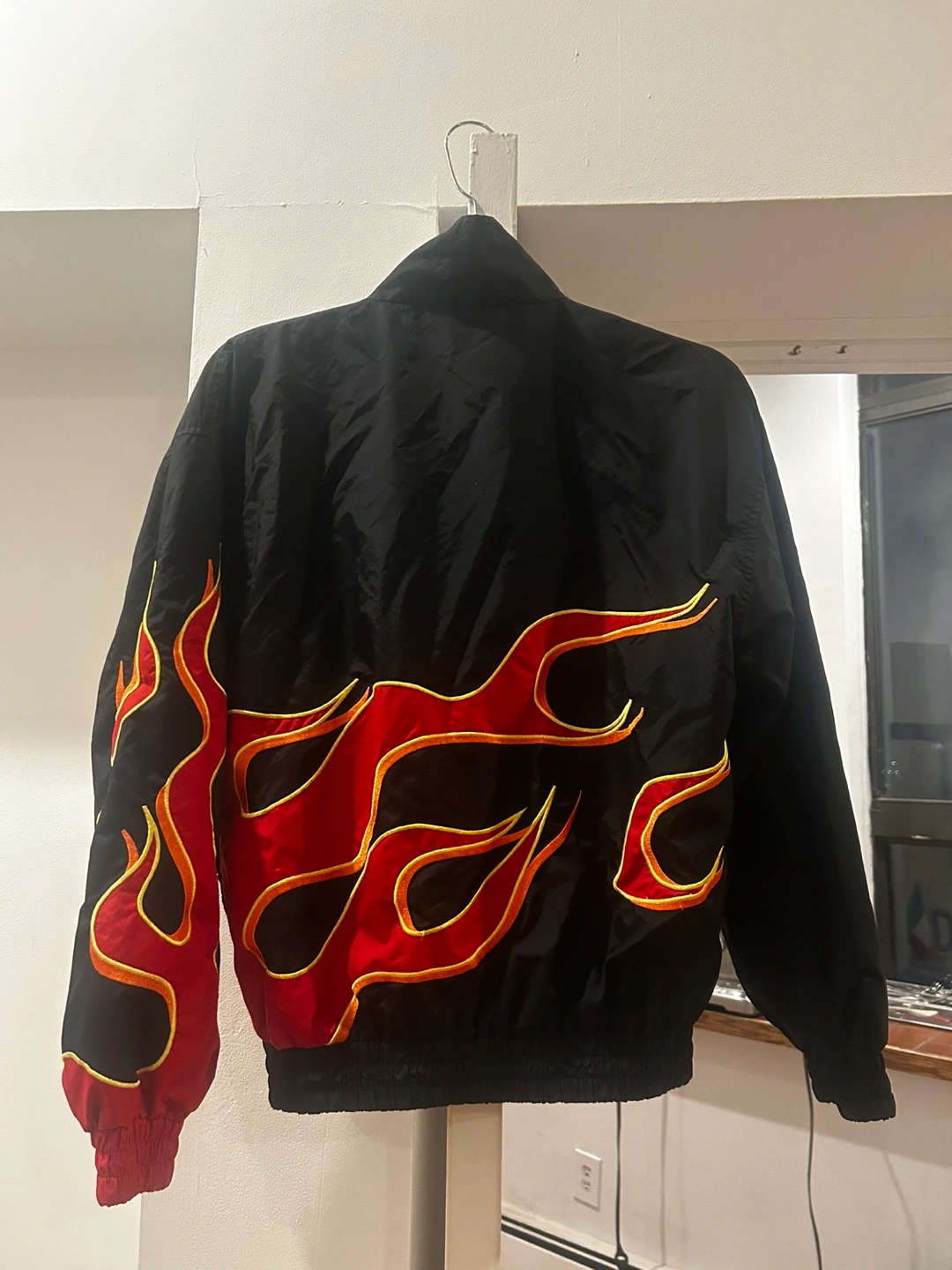 Size S. Full-zip closure. Two exterior pockets . Wrap around embroidered flame print. Elastic waistband + cuffs. Interior lining 100% nylon. Exterior 100% nylon. Made in Macau. Excellent condition.