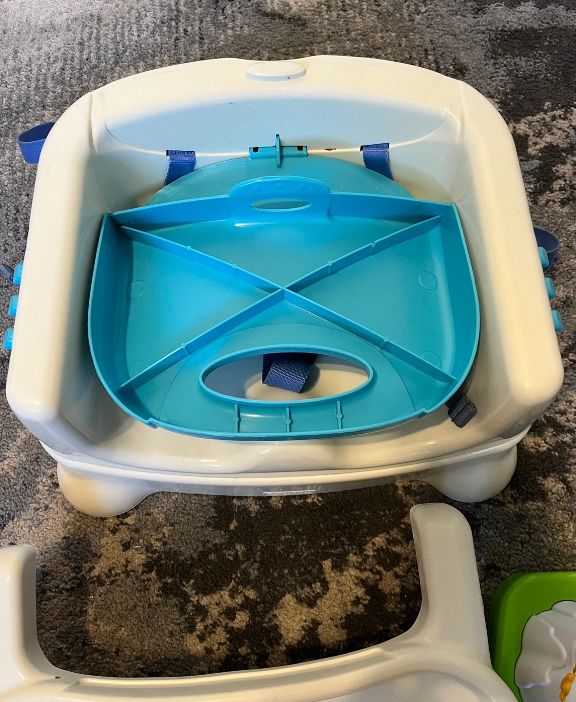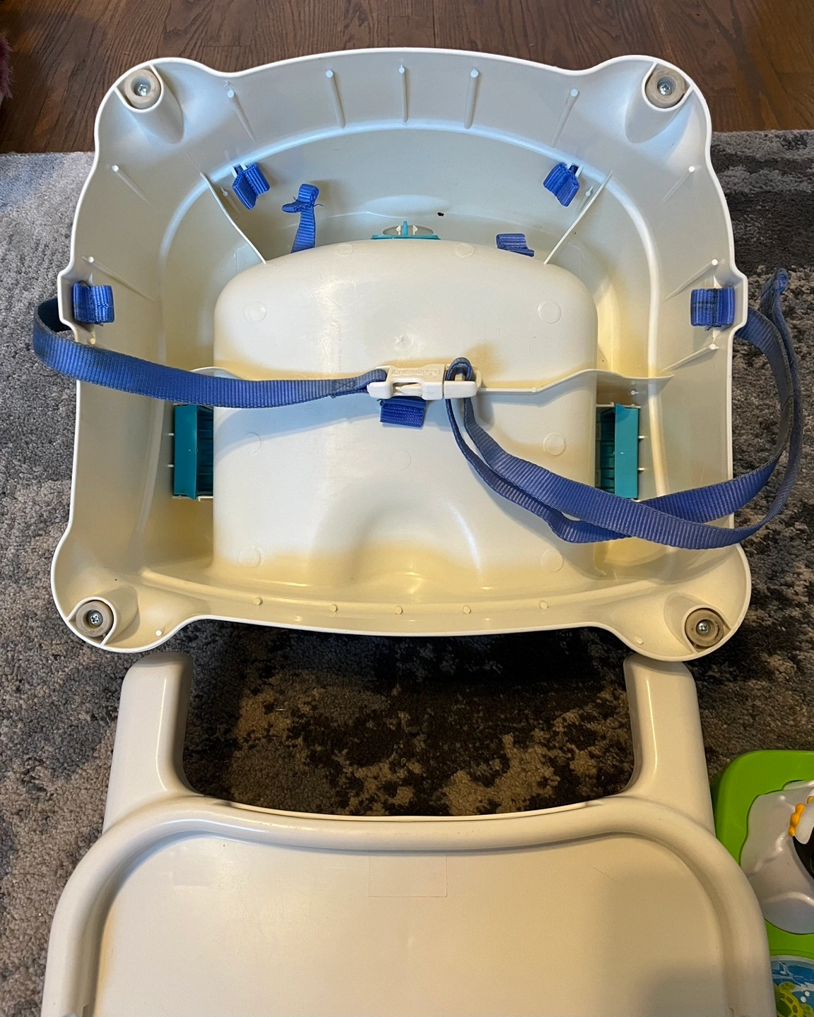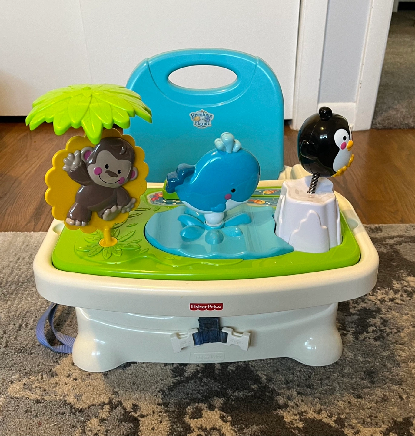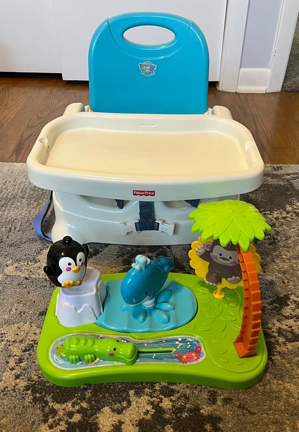 75Playtime High Chair with removable tray, buckles, and seat. Includes a separate activity center featuring a penguin, monkey, whale, and alligator.
