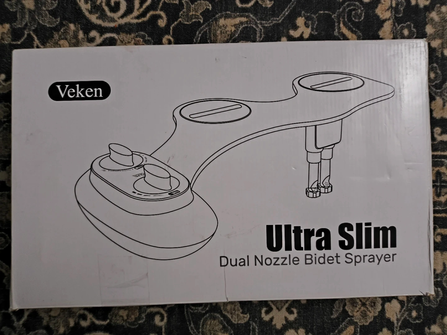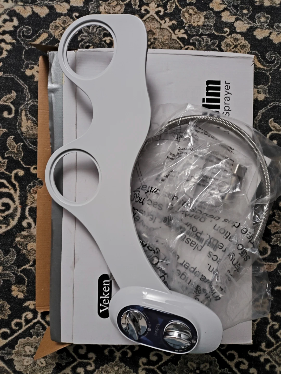 This is a Veken Ultra Slim Dual Nozzle Bidet Sprayer. It's designed for a clean and refreshing experience. Includes all necessary components for installation.