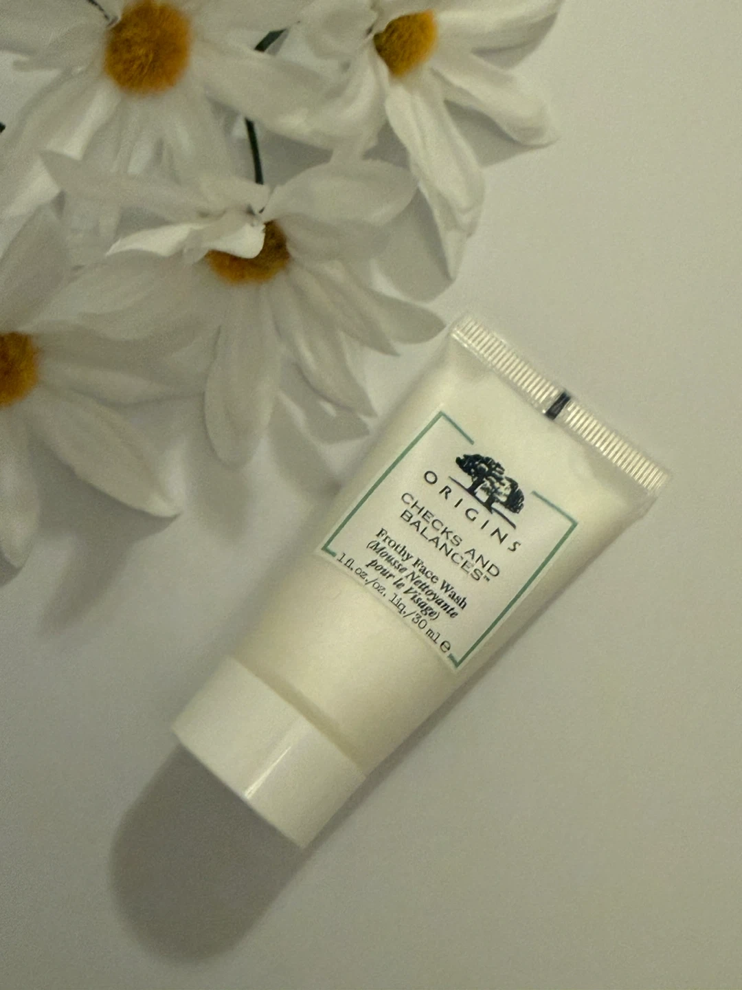 Origins Checks and Balances Frothy Face Wash. This travel-size cleanser is 1 fl. oz. or 30 ml. It's designed to help balance your skin.