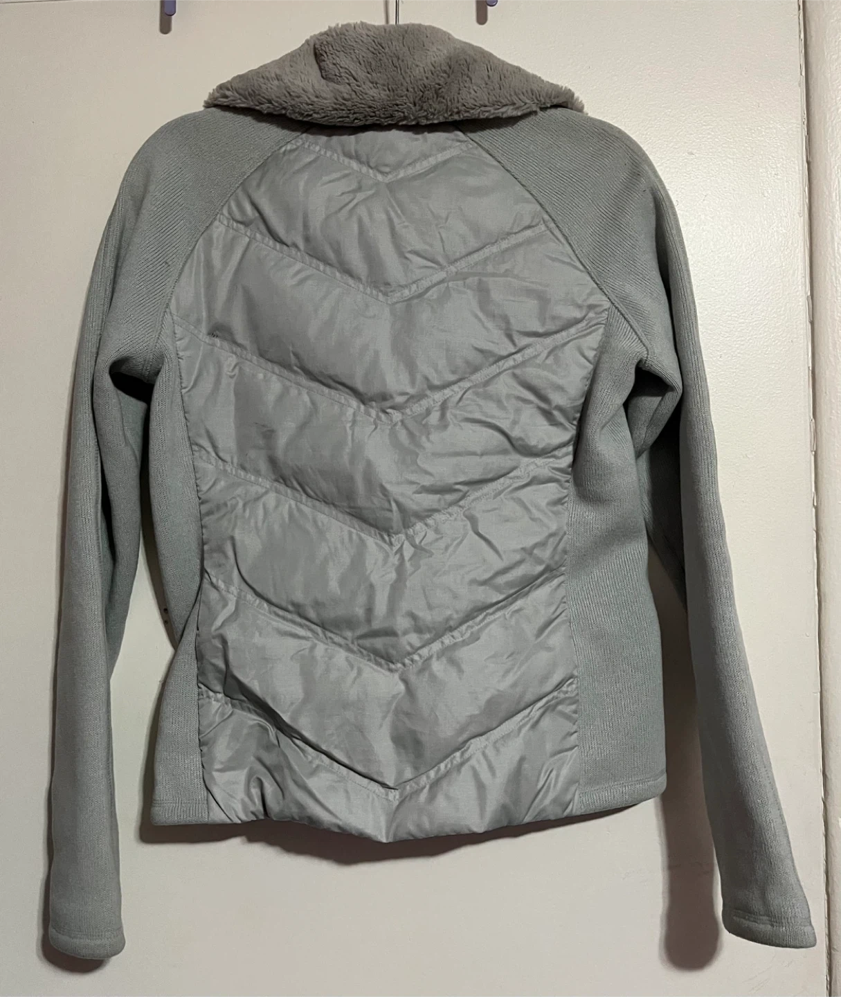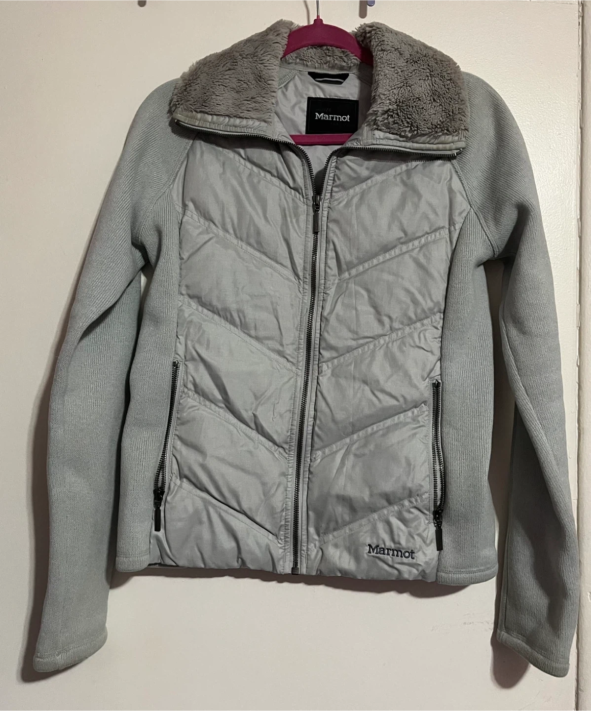 Gray Marmot hybrid jacket featuring insulated quilted panels with soft fleece sleeves and a cozy fleece-lined collar. Lightweight yet warm — perfect for outdoor activities, travel, or everyday wear. Full zip front with zippered pockets for convenience.