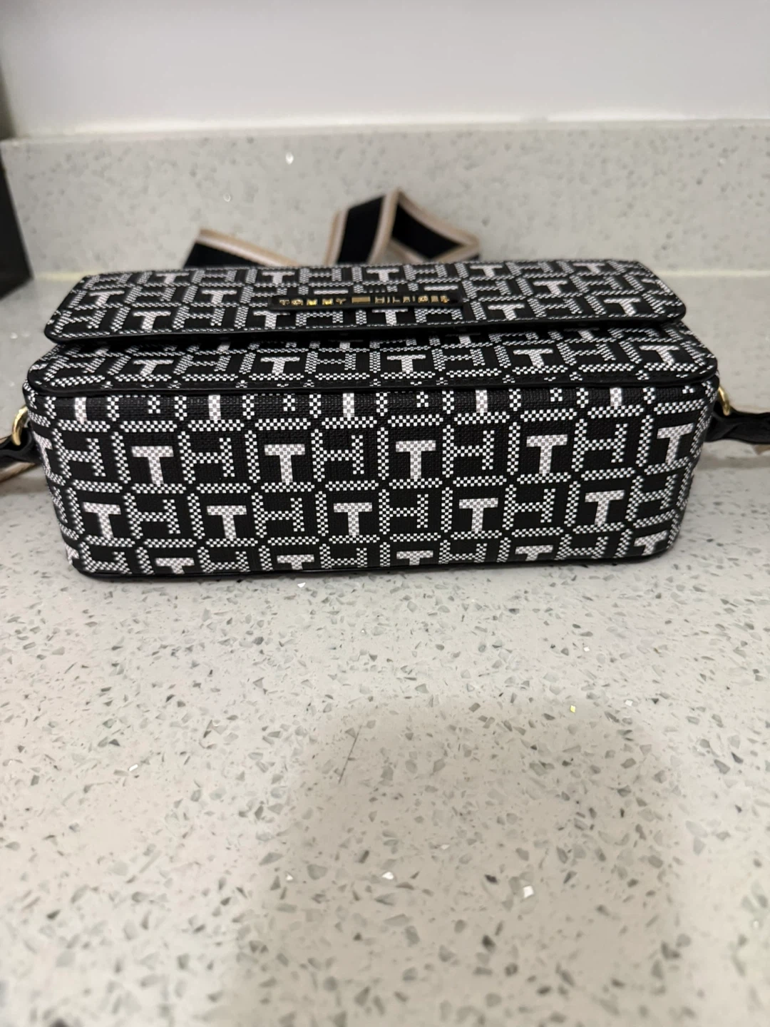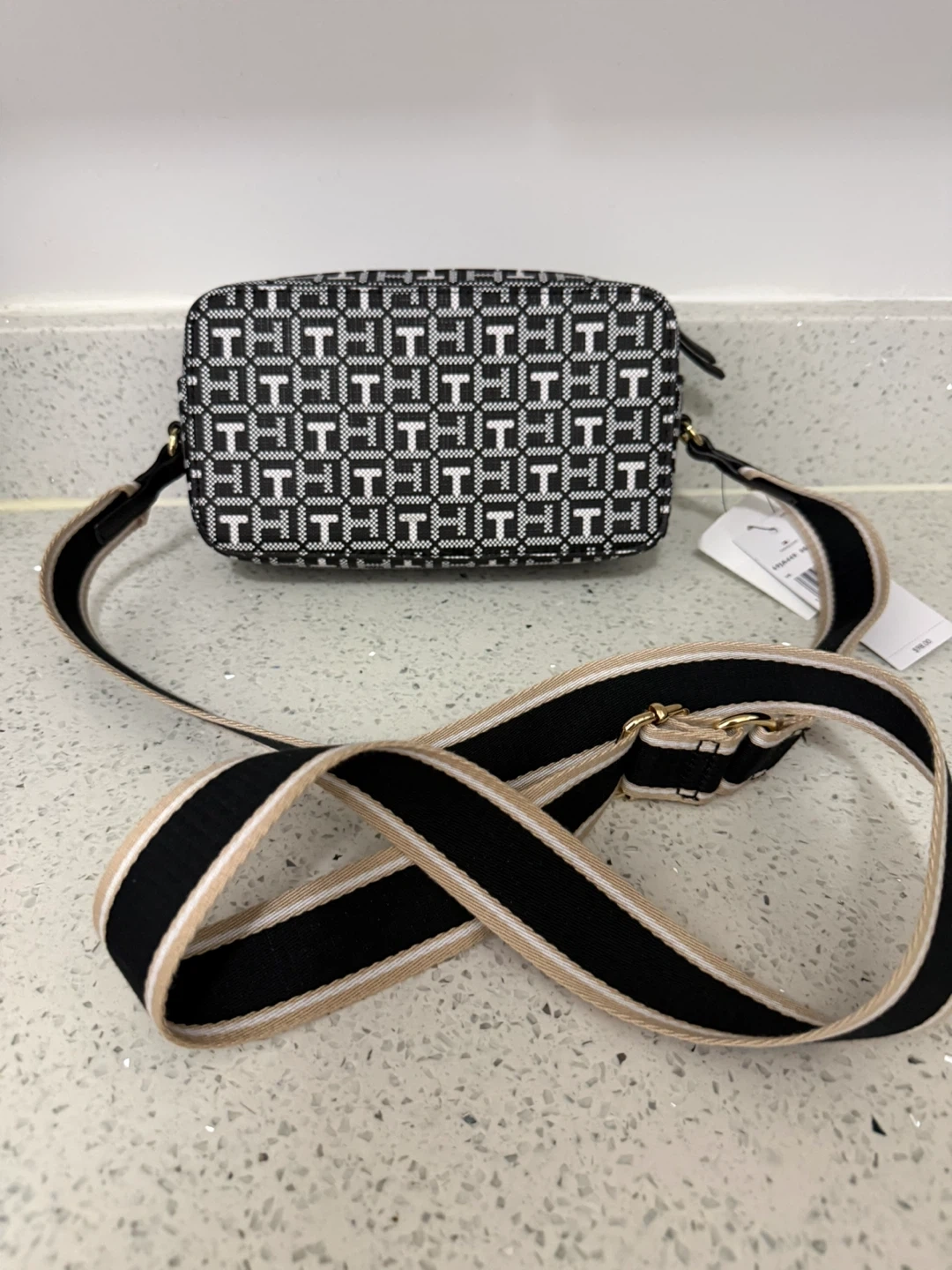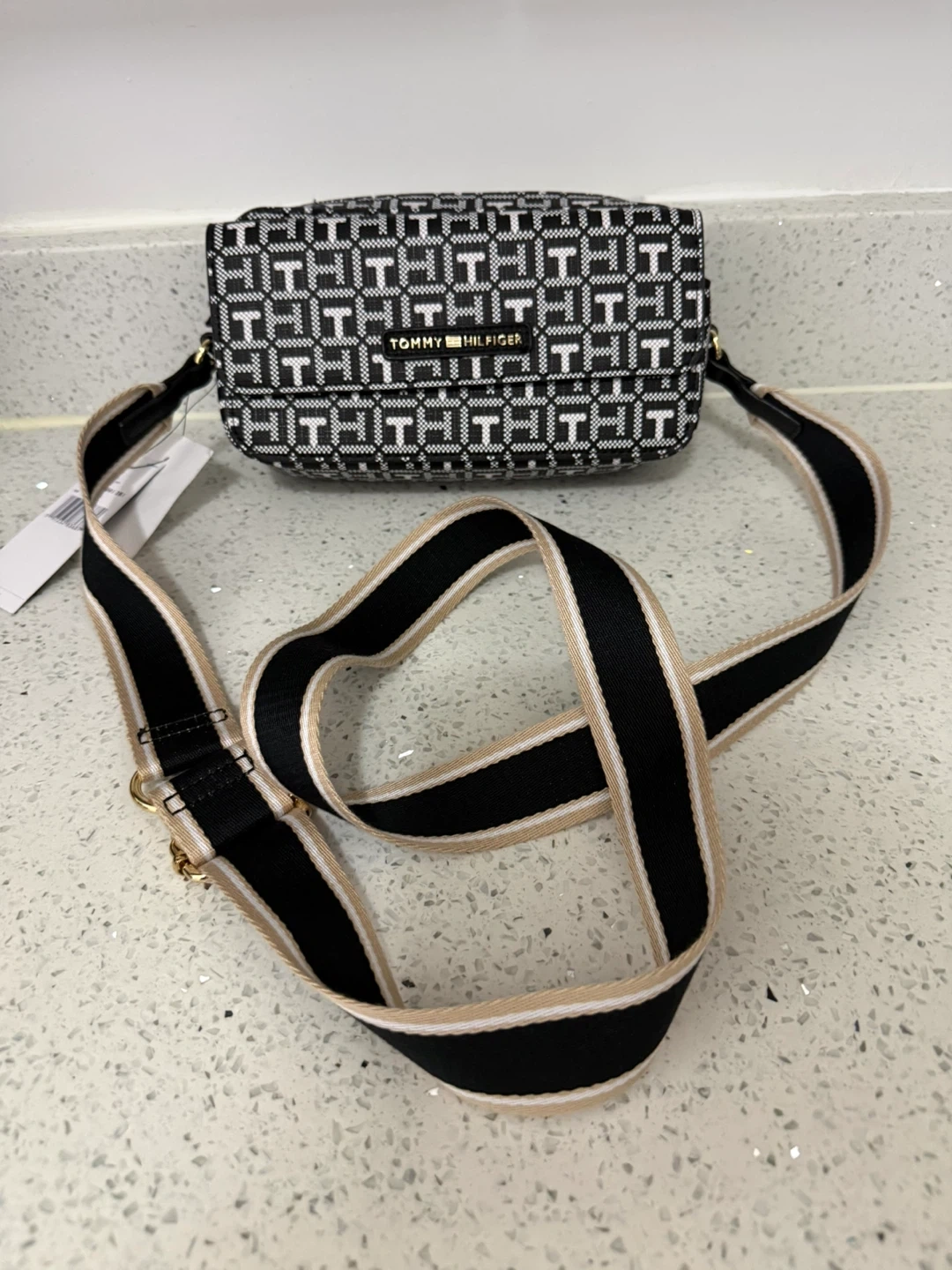 Black and white Tommy Hilfiger camera bag with all-over monogram print. Features a striped adjustable crossbody strap. Zip closure.