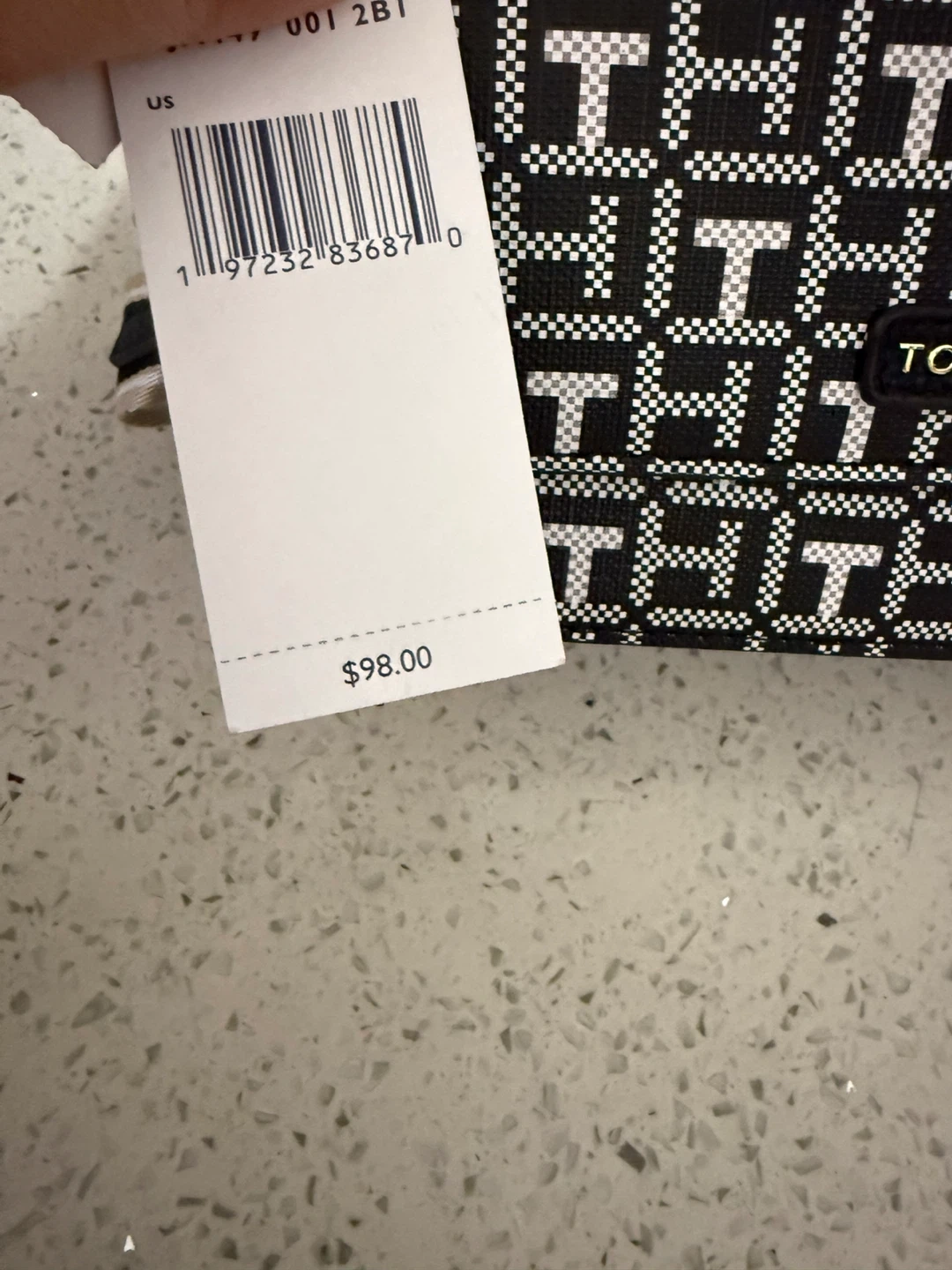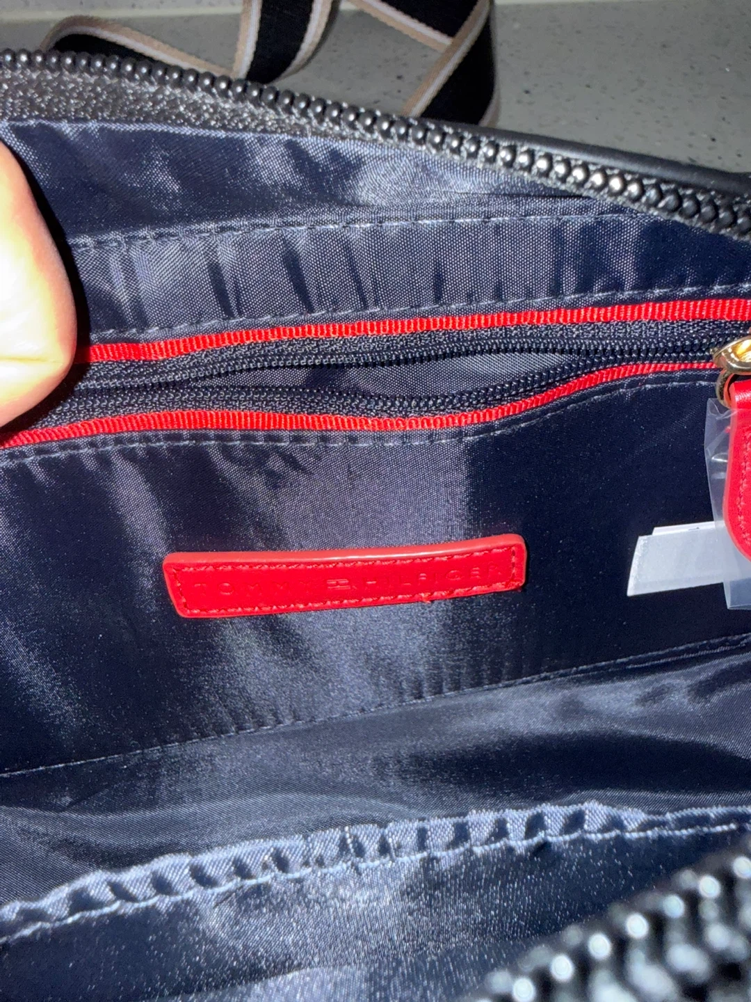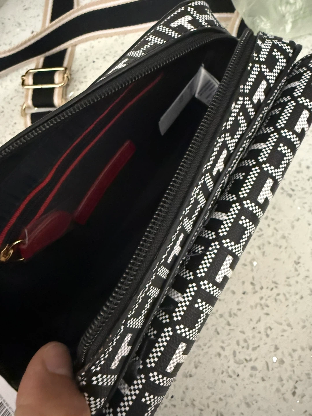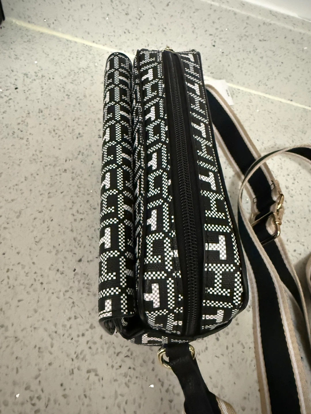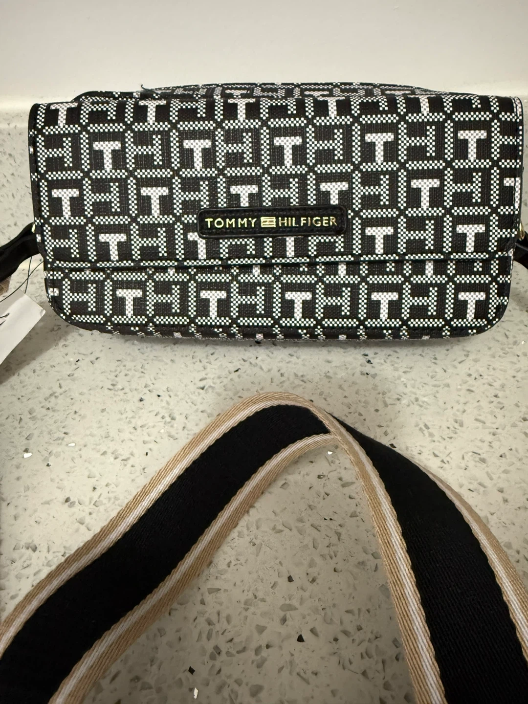 Black and white Tommy Hilfiger camera bag with all-over monogram print. Features a striped adjustable crossbody strap. Zip closure.