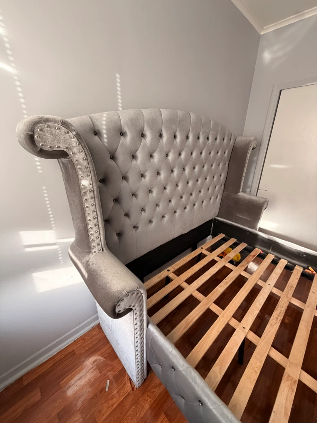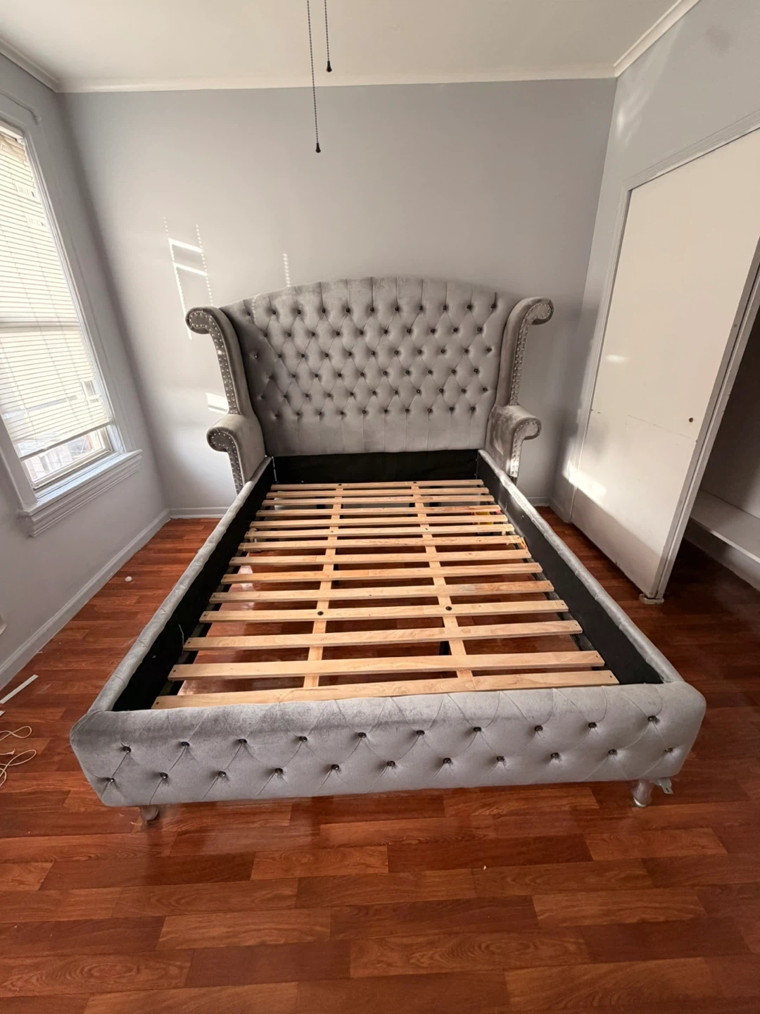 Selling a stylish upholstered bed frame. This bed frame features a tufted headboard design and a neutral gray color that will complement any bedroom decor. It's in great condition and ready to add a touch of elegance to your space