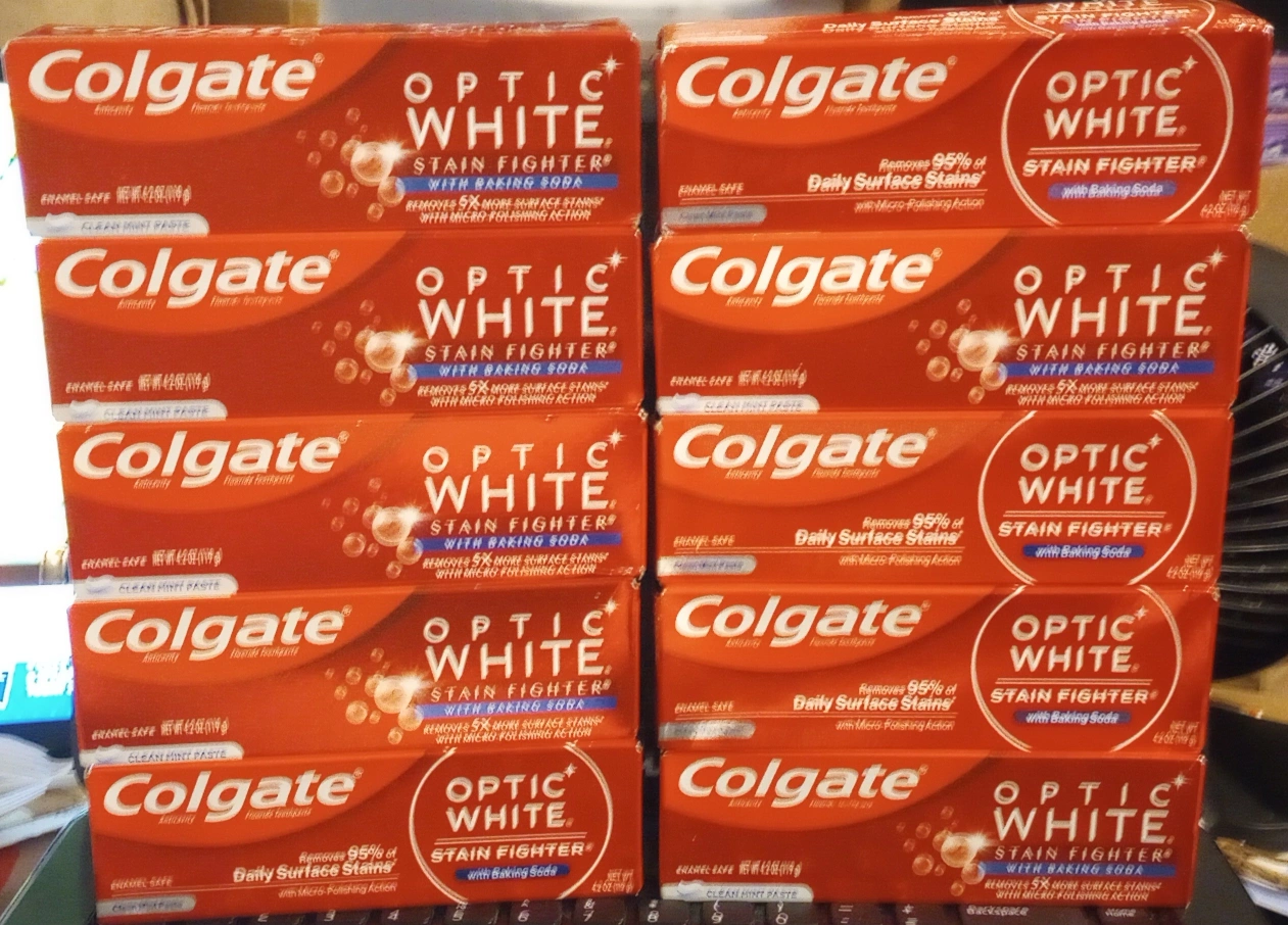 Selling 10 boxes of Colgate Optic White Stain Fighter toothpaste w/Baking Soda Sz. 4.2 oz Qty: 10 Type: Clean Mint Paste Only available for pickup **Check out my other listings and build a large bundle for delivery; minimum for delivery is $70