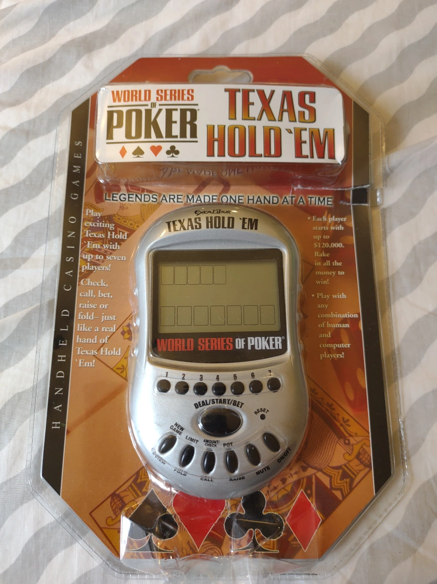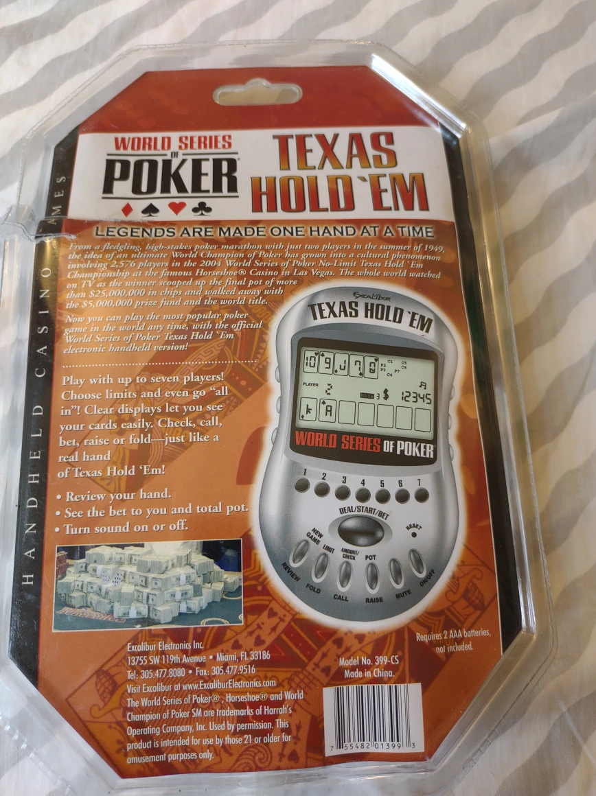 44Handheld electronic game. Play with up to seven players. Choose limits and even go all in! Clear displays let you see your cards easily. Check, call, bet, raise or fold - just like a real Texas Hold 'Em!