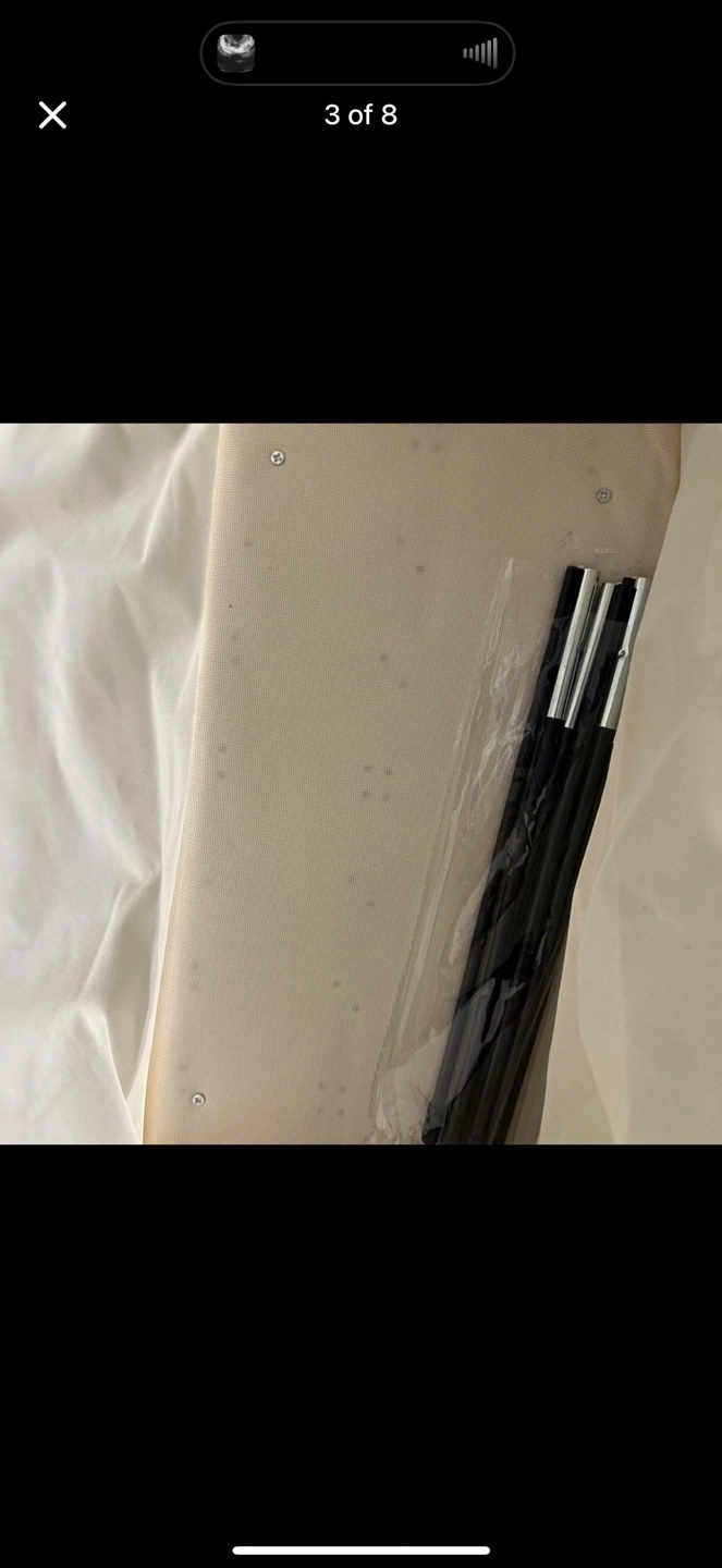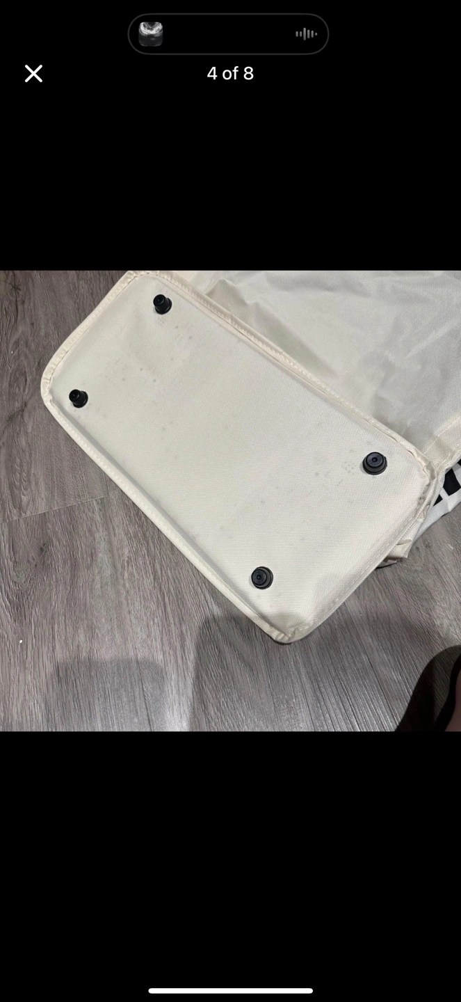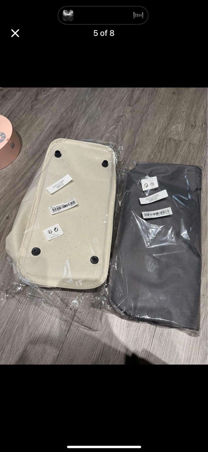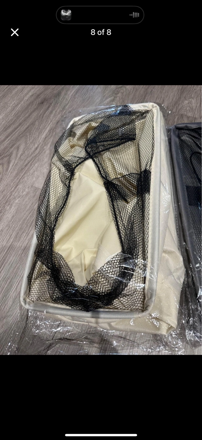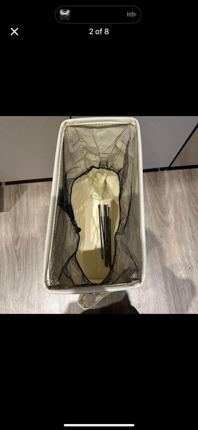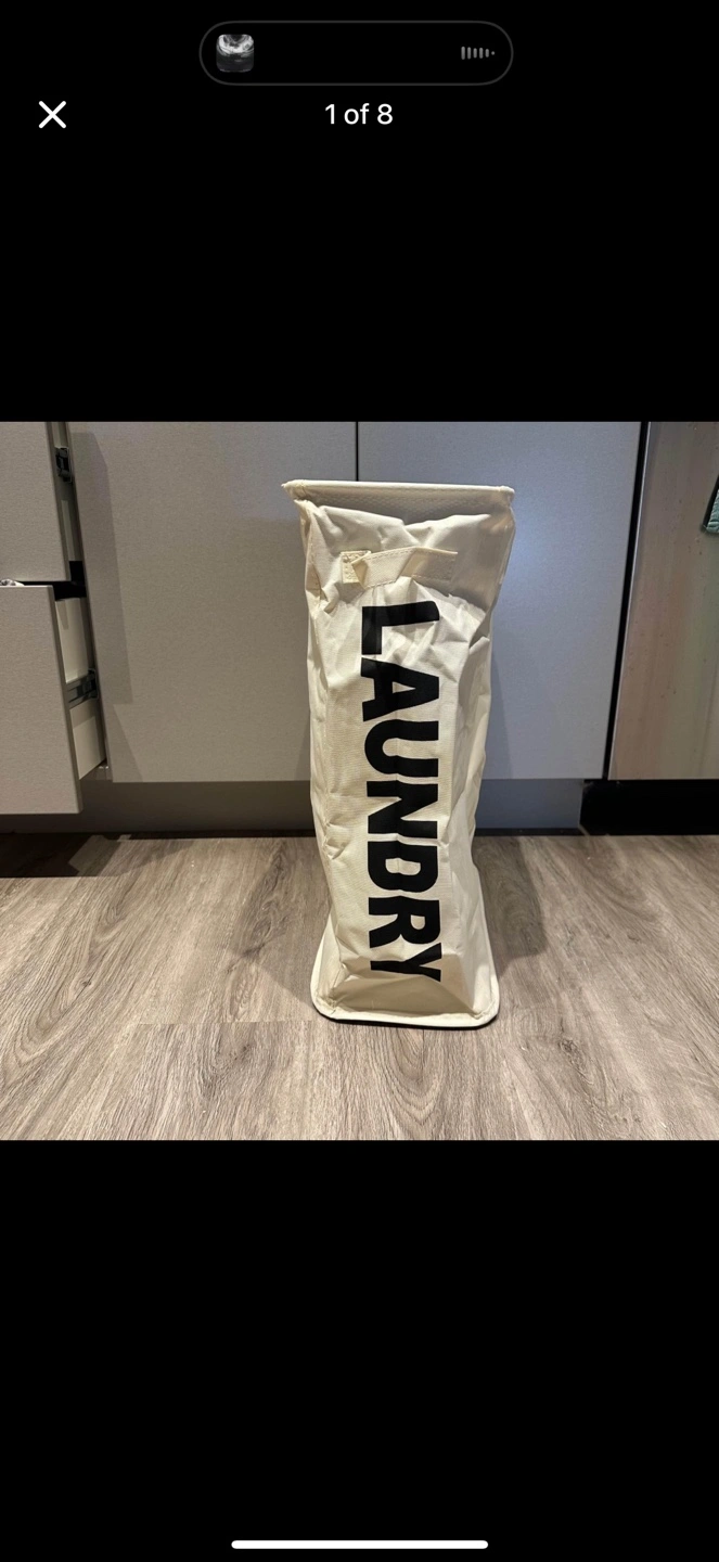White canvas laundry hamper with a black liner. Stands up on its own and comes with a metal frame. 2 pieces 🧡