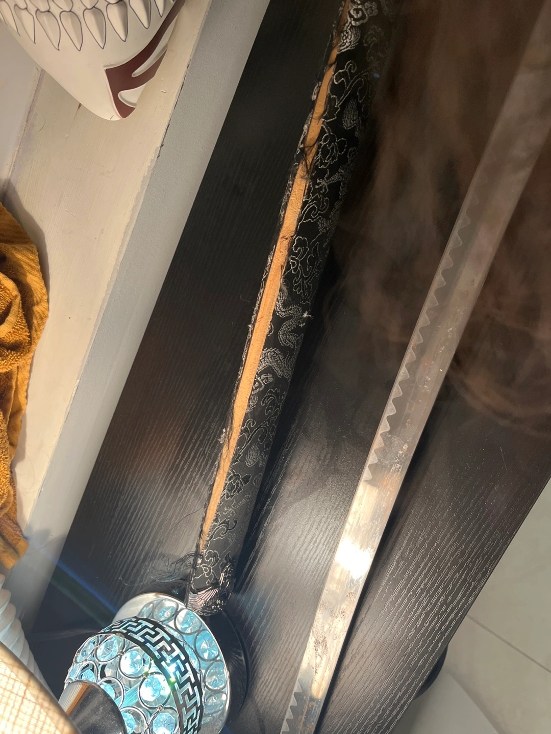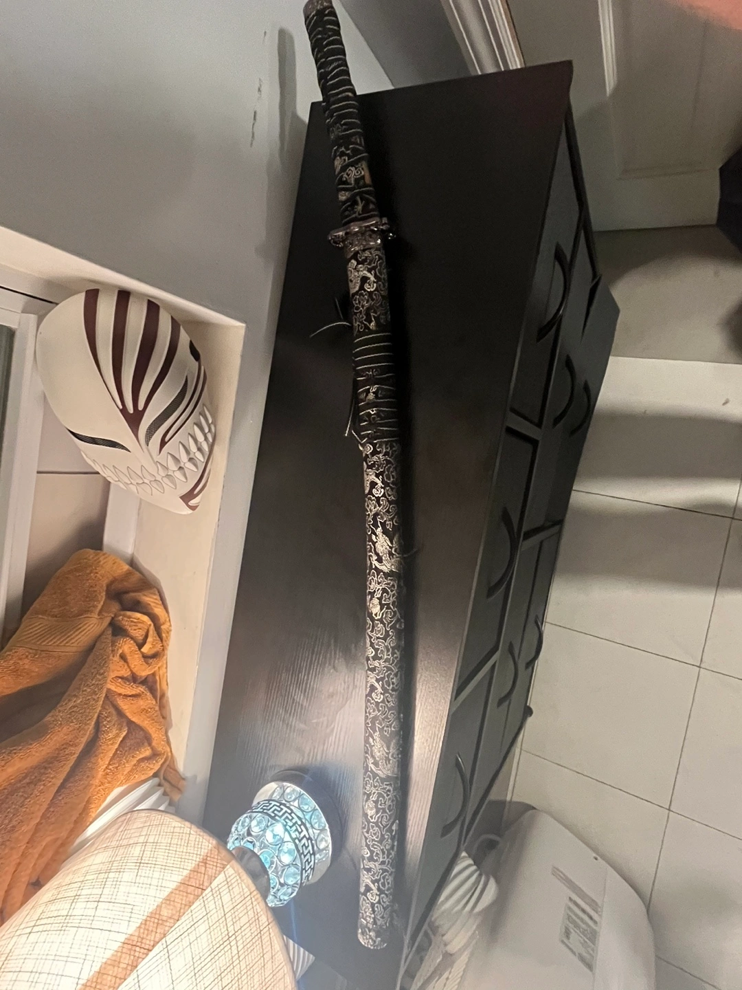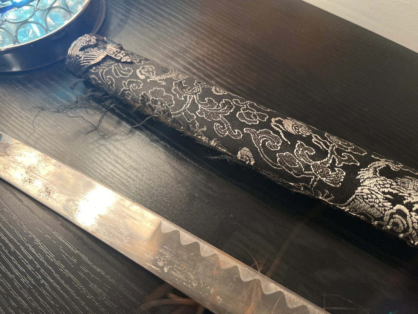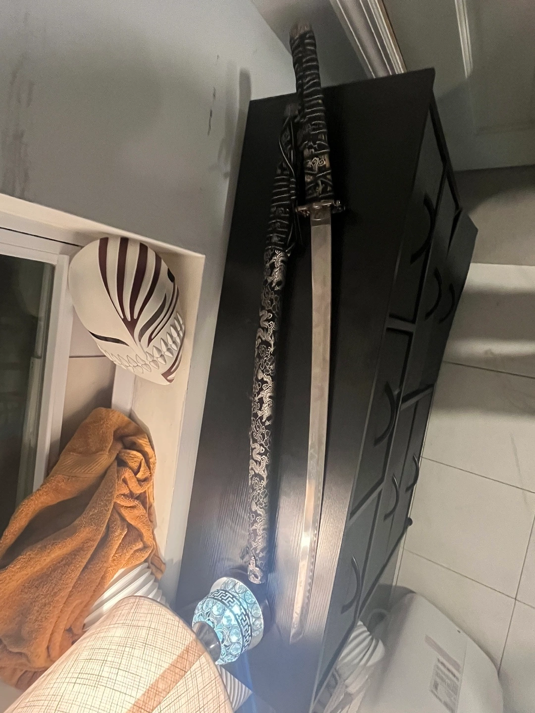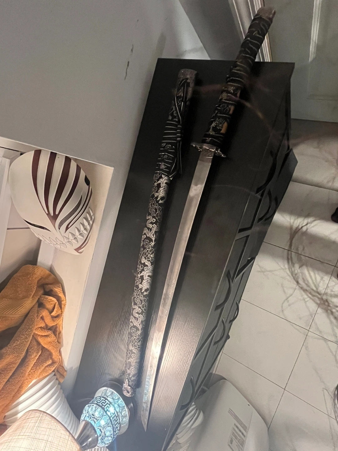 Katana sword with black and silver design on the handle. Has a black scabbard. Silver blade with a black handle. Blade is in good condition but part of the sheath is ripped.