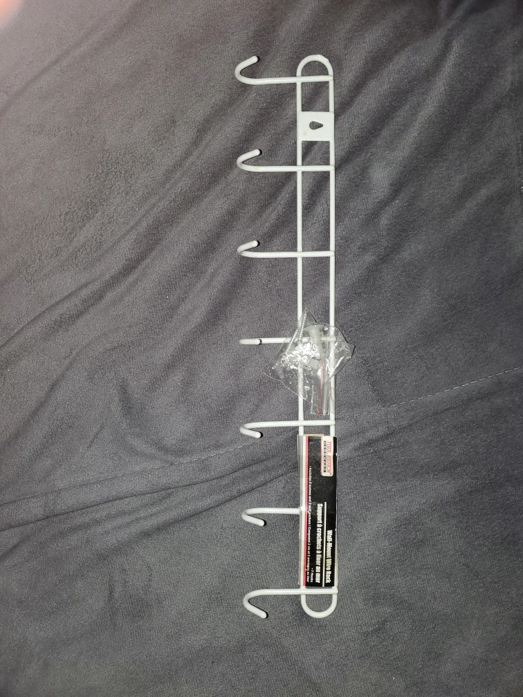756White wire rack with hooks, great for organizing tools or kitchen items.