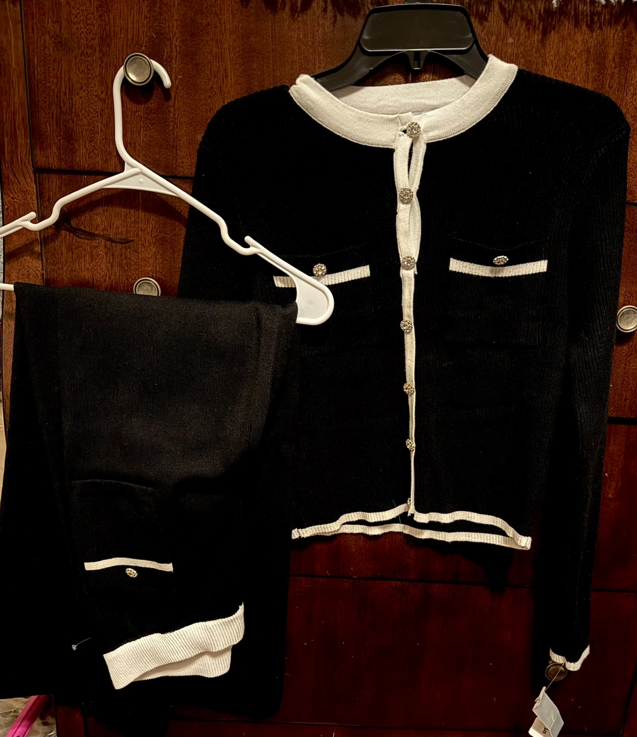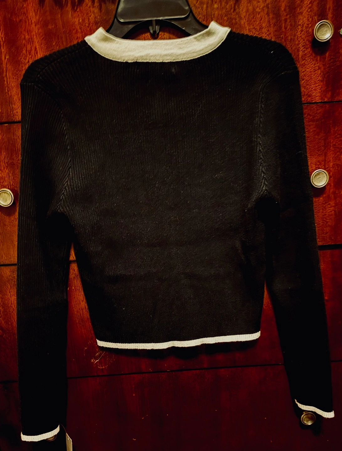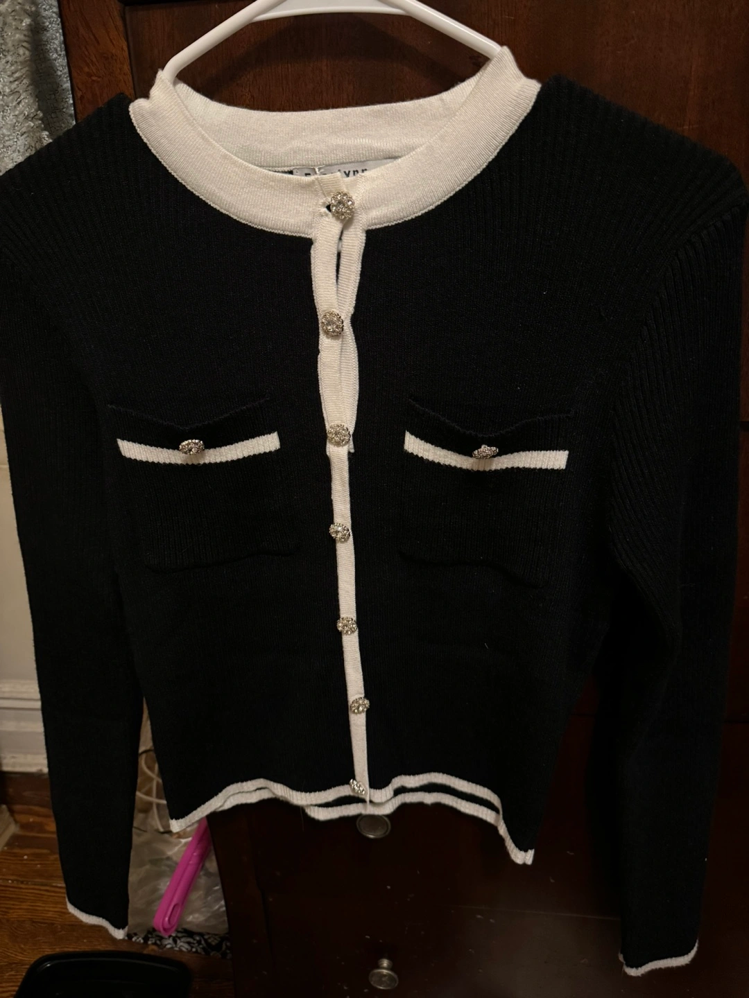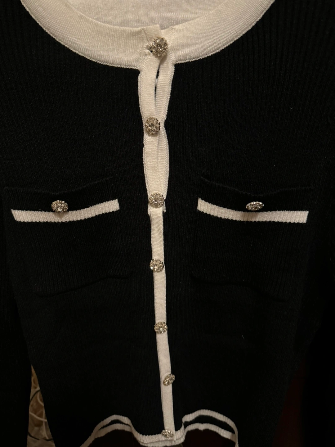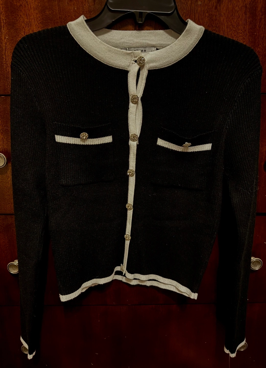 Black and white cardigan with rhinestone buttons. Long sleeves. Two pockets on front. White trim around collar, bottom, and pockets.