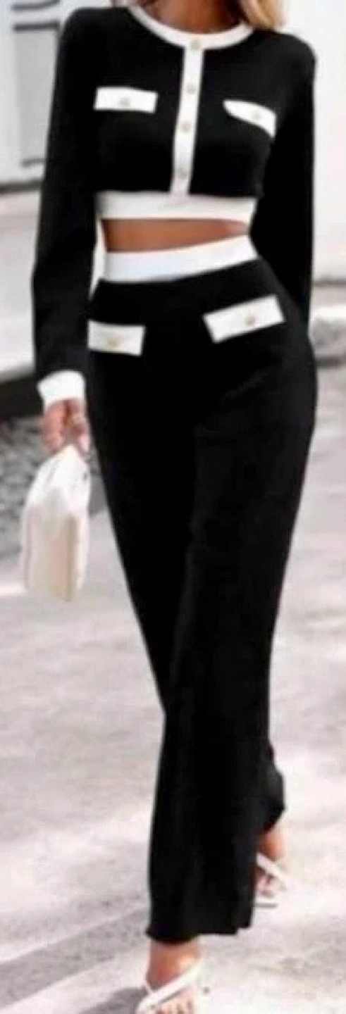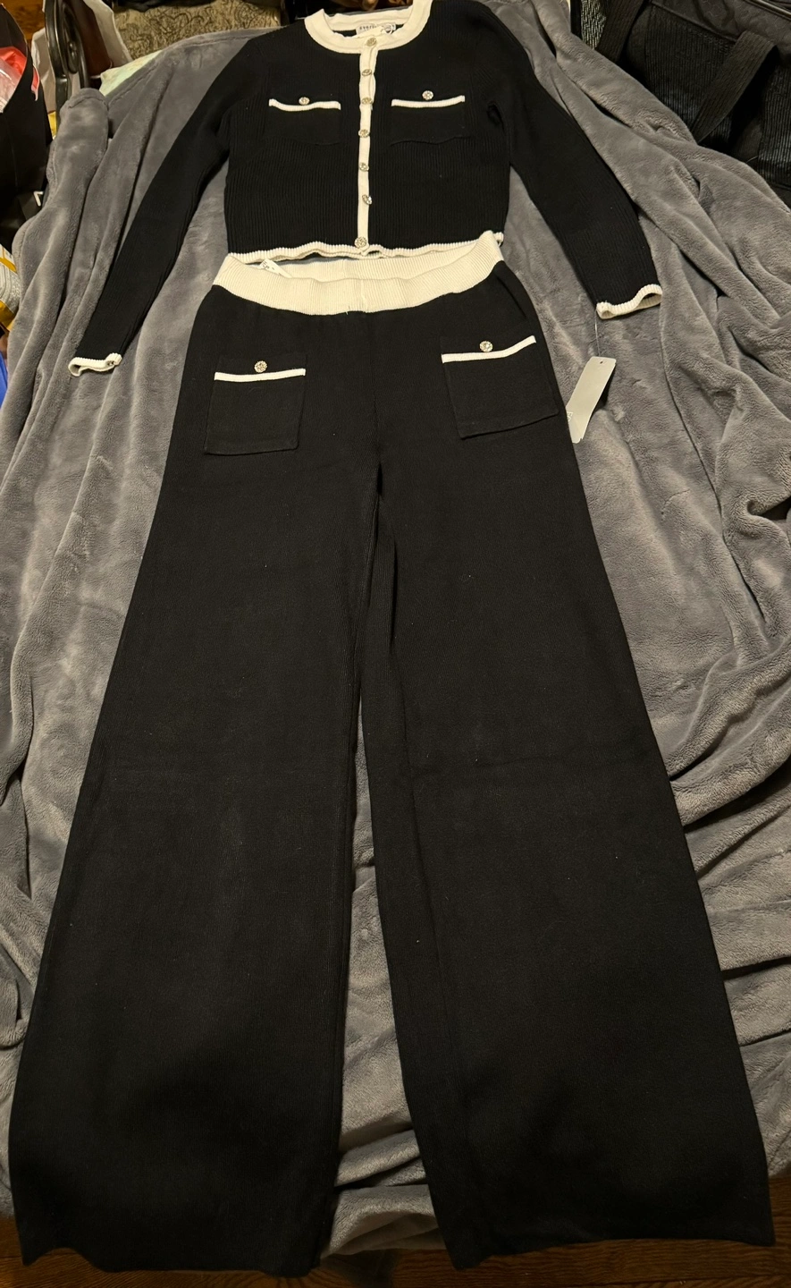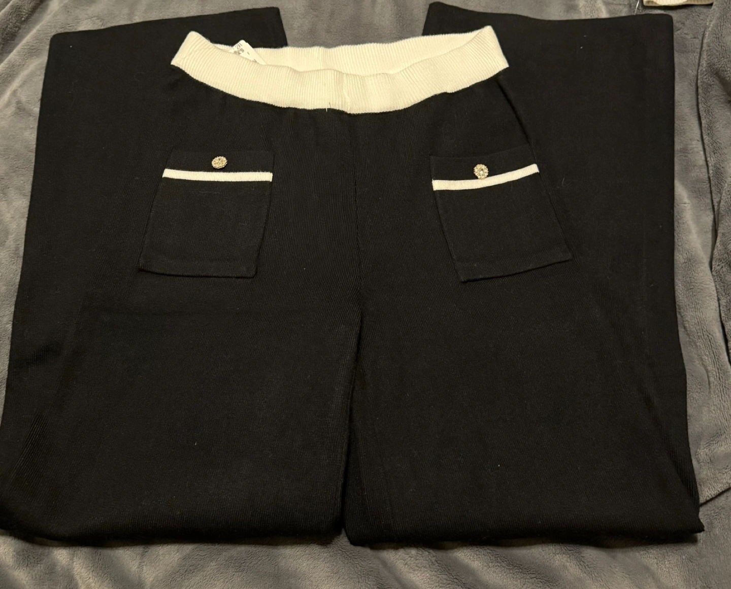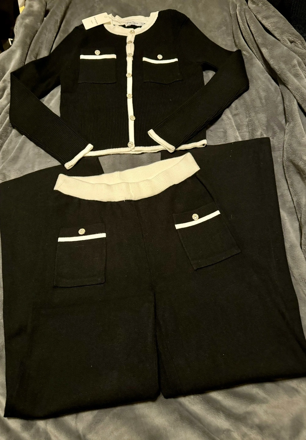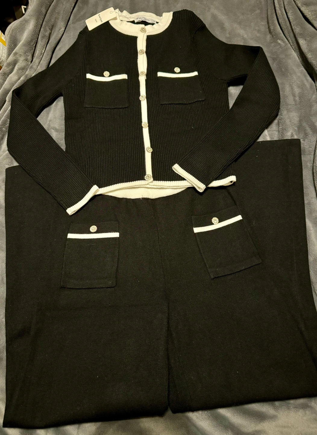 Black and white cardigan with rhinestone buttons. Long sleeves. Two pockets on front. White trim around collar, bottom, and pockets.