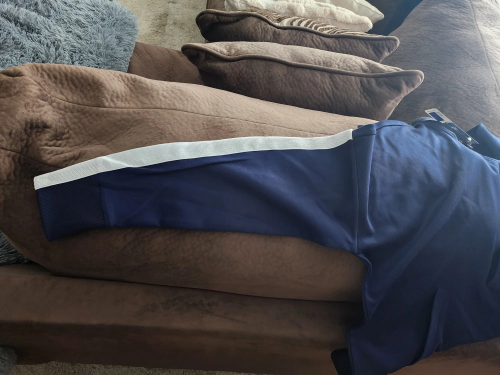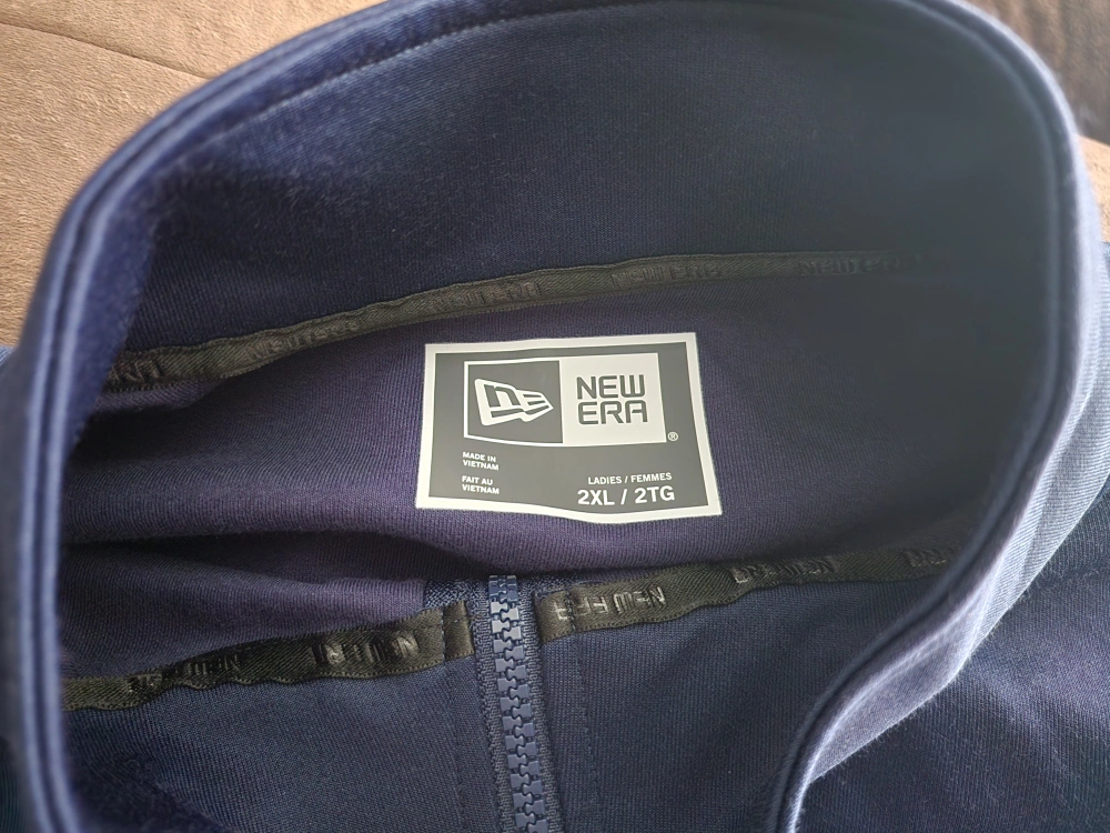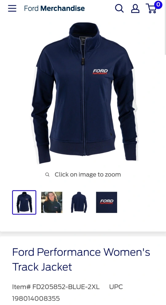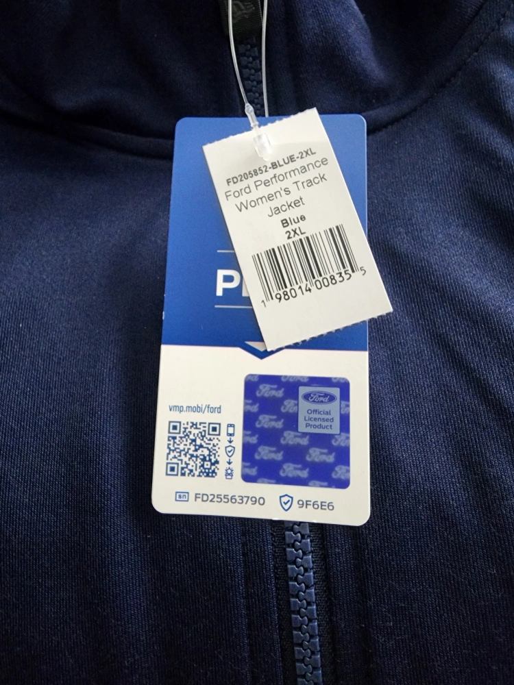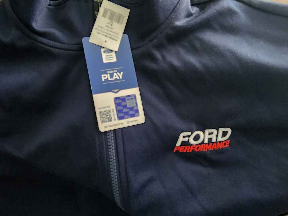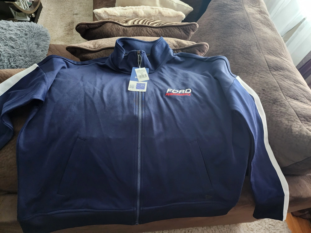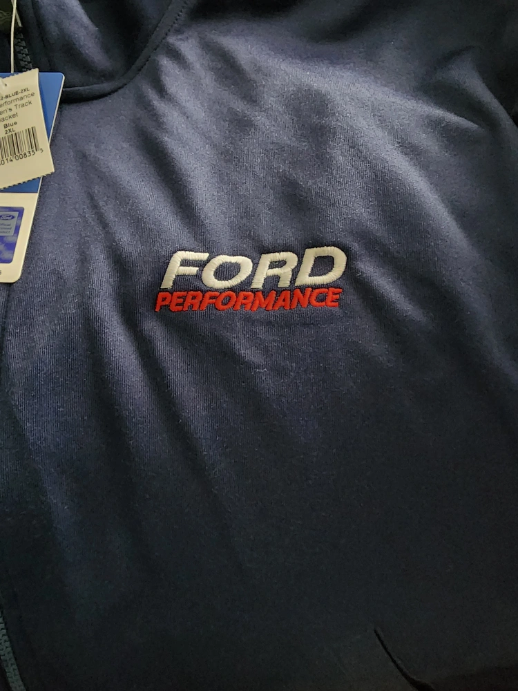Blue zip-up jacket with white stripes on the sleeves, Ford Performance logo on the chest and back. Size 2XL. Brand new. Never written.