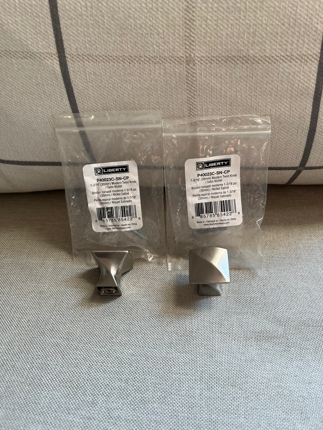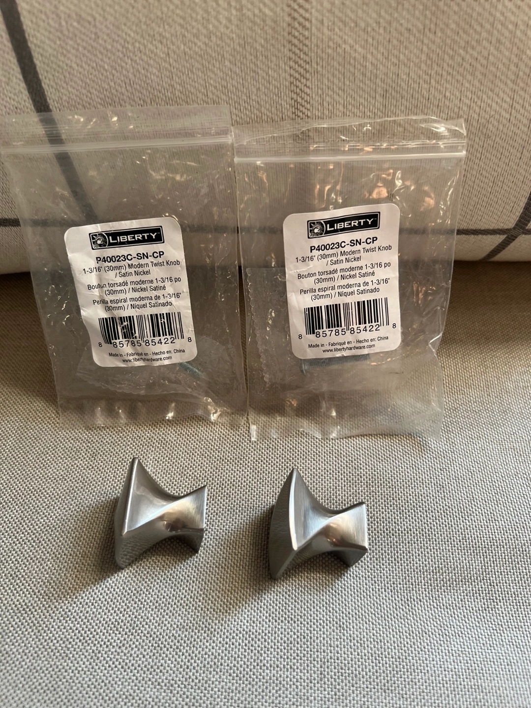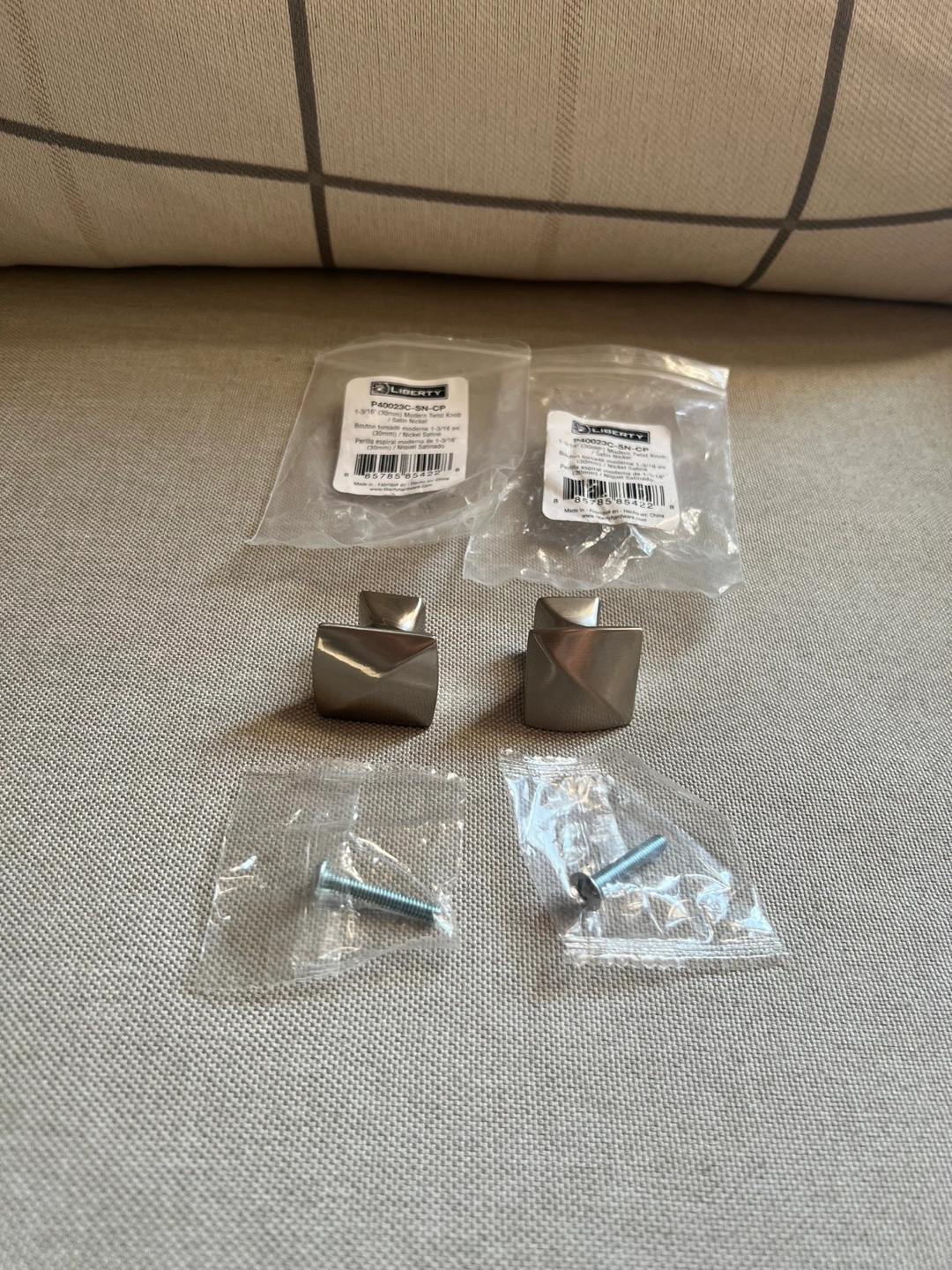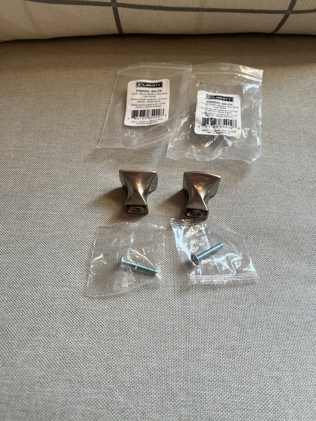 692Two cabinet knobs with screws. Satin nickel finish. 1-3/16 inch.
