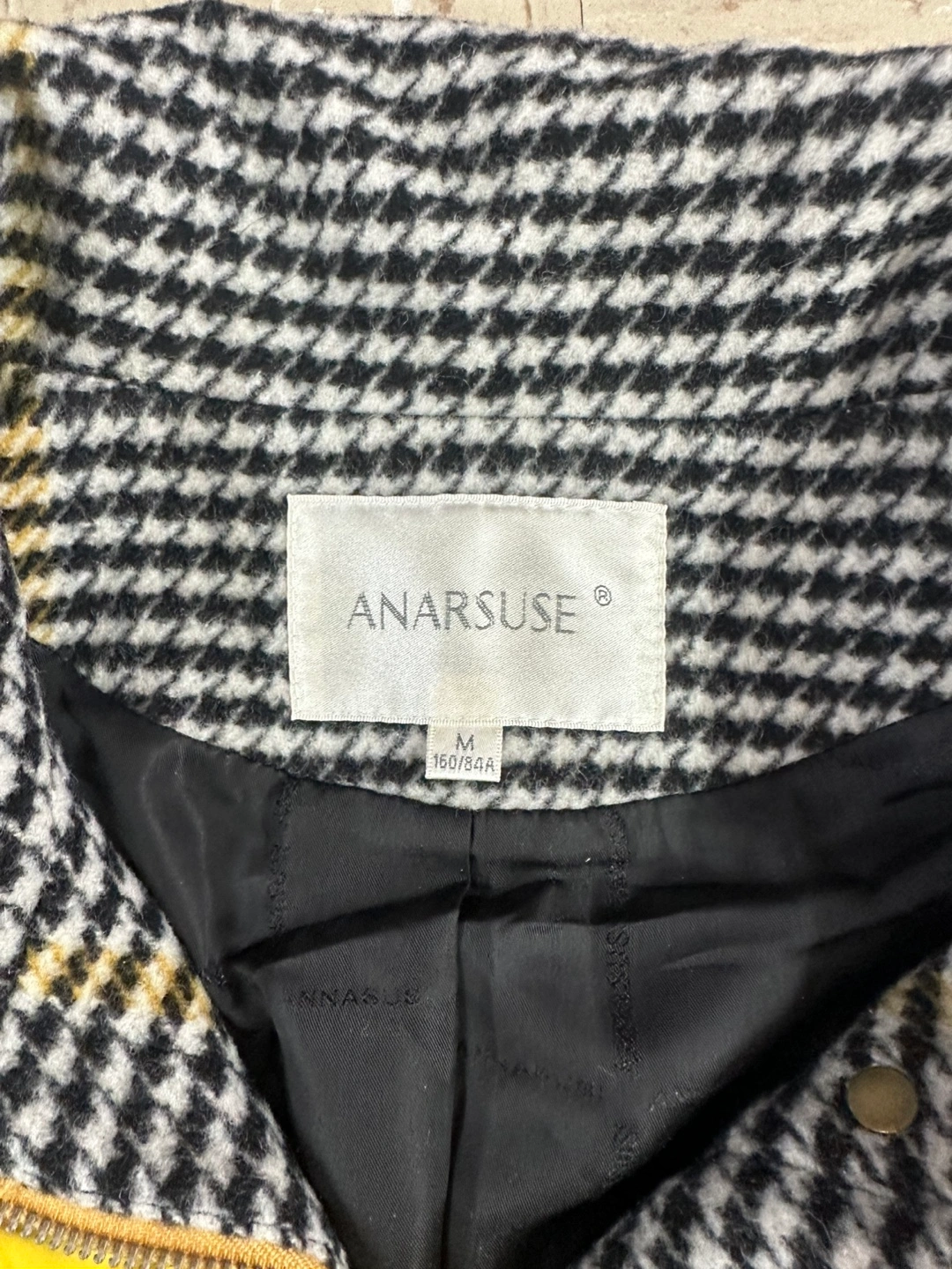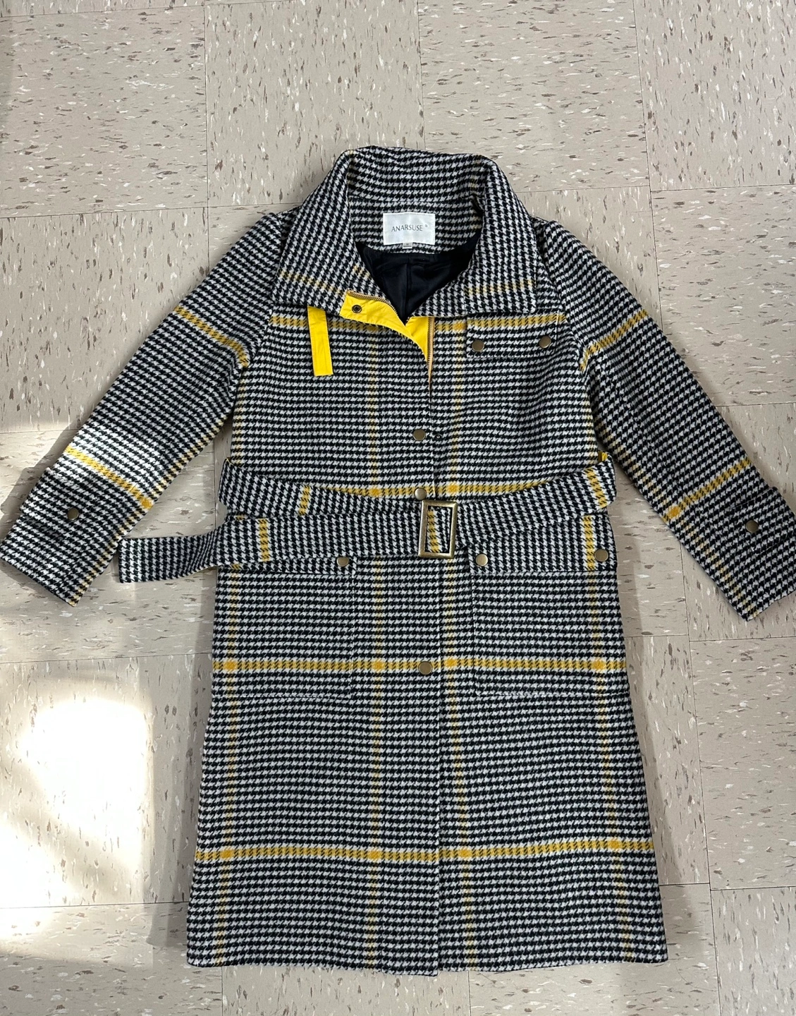 25Black and yellow plaid coat with a belt. Long sleeves, button closure.