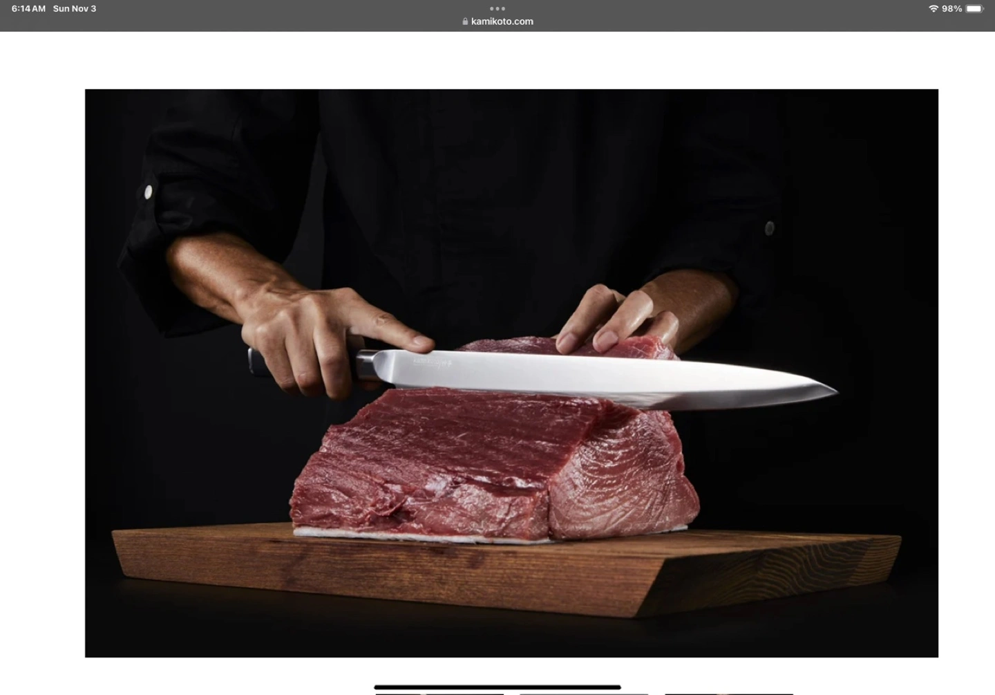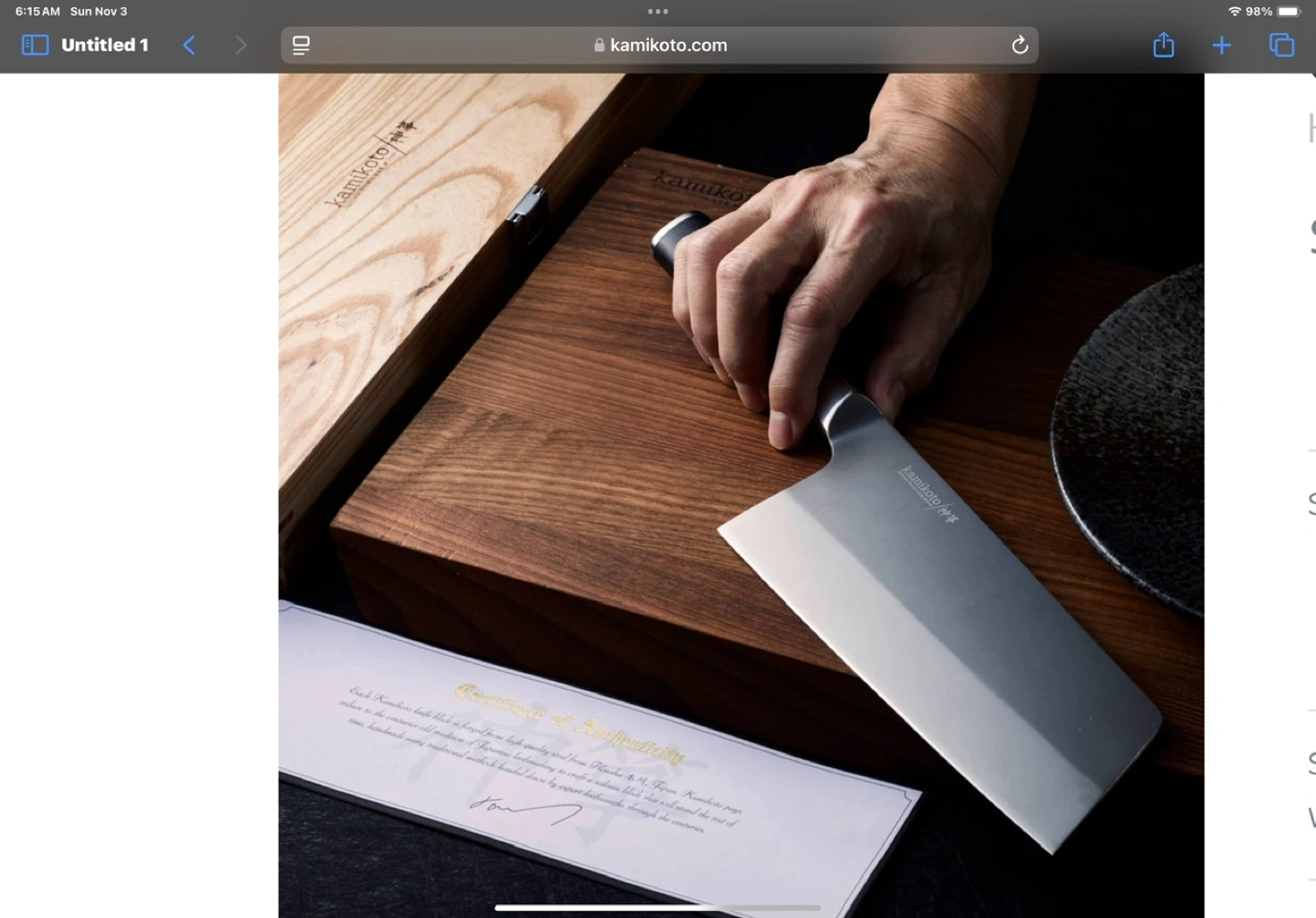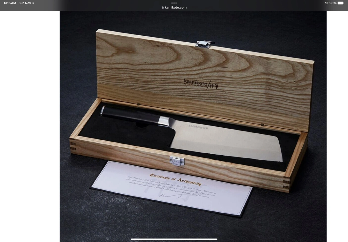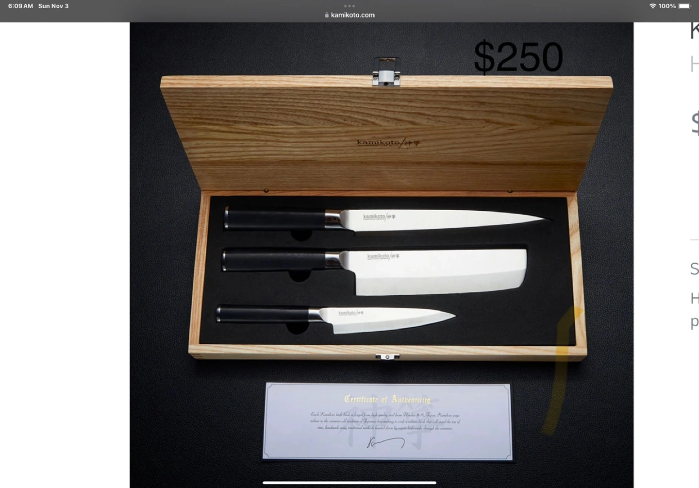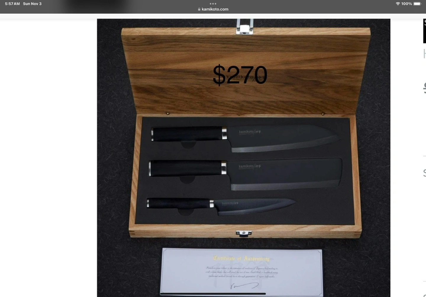 76Set of 3 knives with black handles and wooden box. Certificate of Authenticity included.