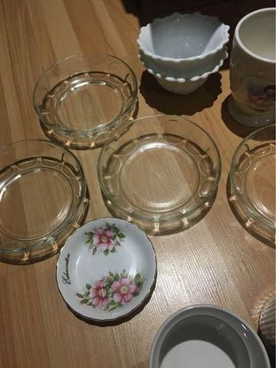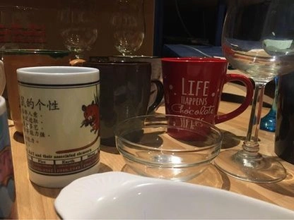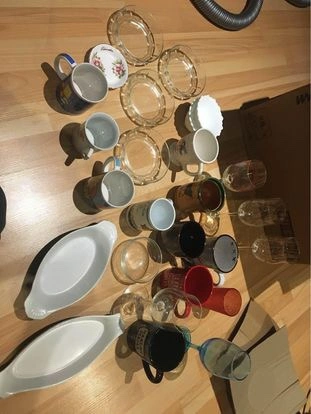 Assortment of mugs, dishes, and glasses. Some are themed, some are plain.