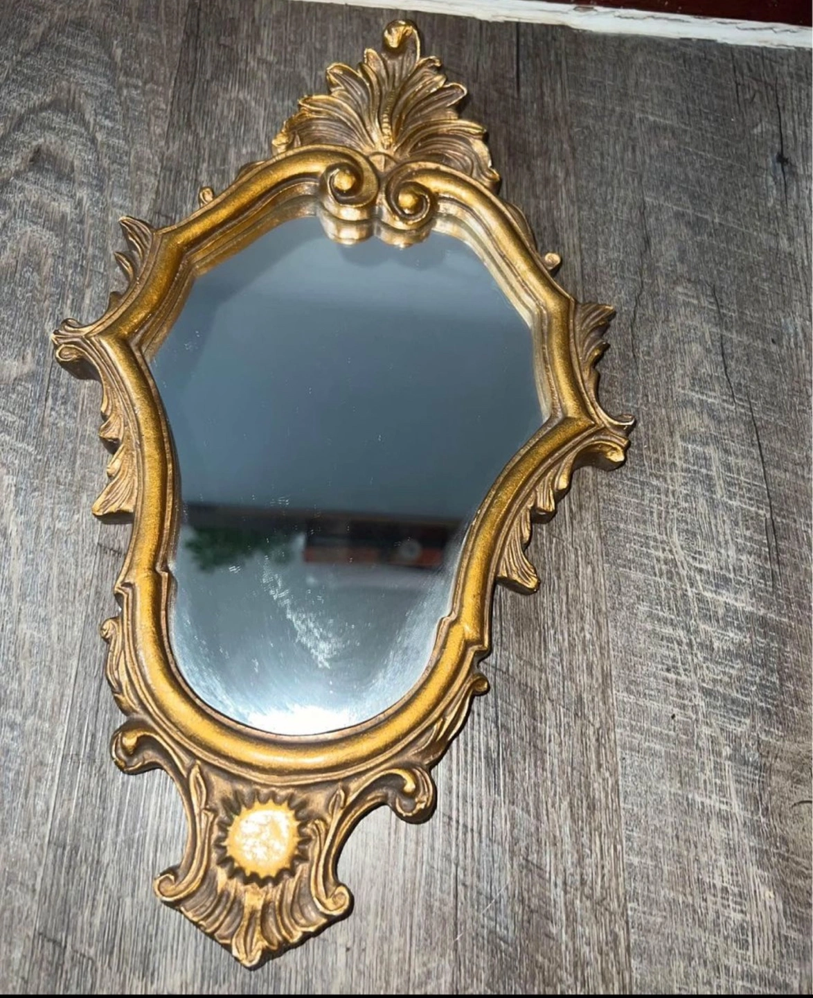 713Gold ornate wall mirror. Features a detailed design. VTG Italian Florentine Ornate Wall Mirror Gold Gilt Frame Hollywood Regency MCM Vintage Italian Florentine Ornate Gold Gilt Mirror Frame Antique Handmade Hollywood Regency Mid-century modern This wall mirror is solid in design, casted with an intricate patterns, with a soft matte gold color, and has a built-in hanging ring on the back of frame for easy hanging. This is a handsome eye-catching vintage mirror, with a restrained Hollywood Regency style that works beautifully with both a formal or more relaxed settings. Frame Measures about inches in total length, by 9 inches in total width, by 1 inch in depth. Mirror measures about 8 inches in total length, by 7 inches in total width. Good Vintage condition. Mirror has no cracks and no chips - With only Very little surface wear. Please view all pictures for details and feel free to ask any questions.