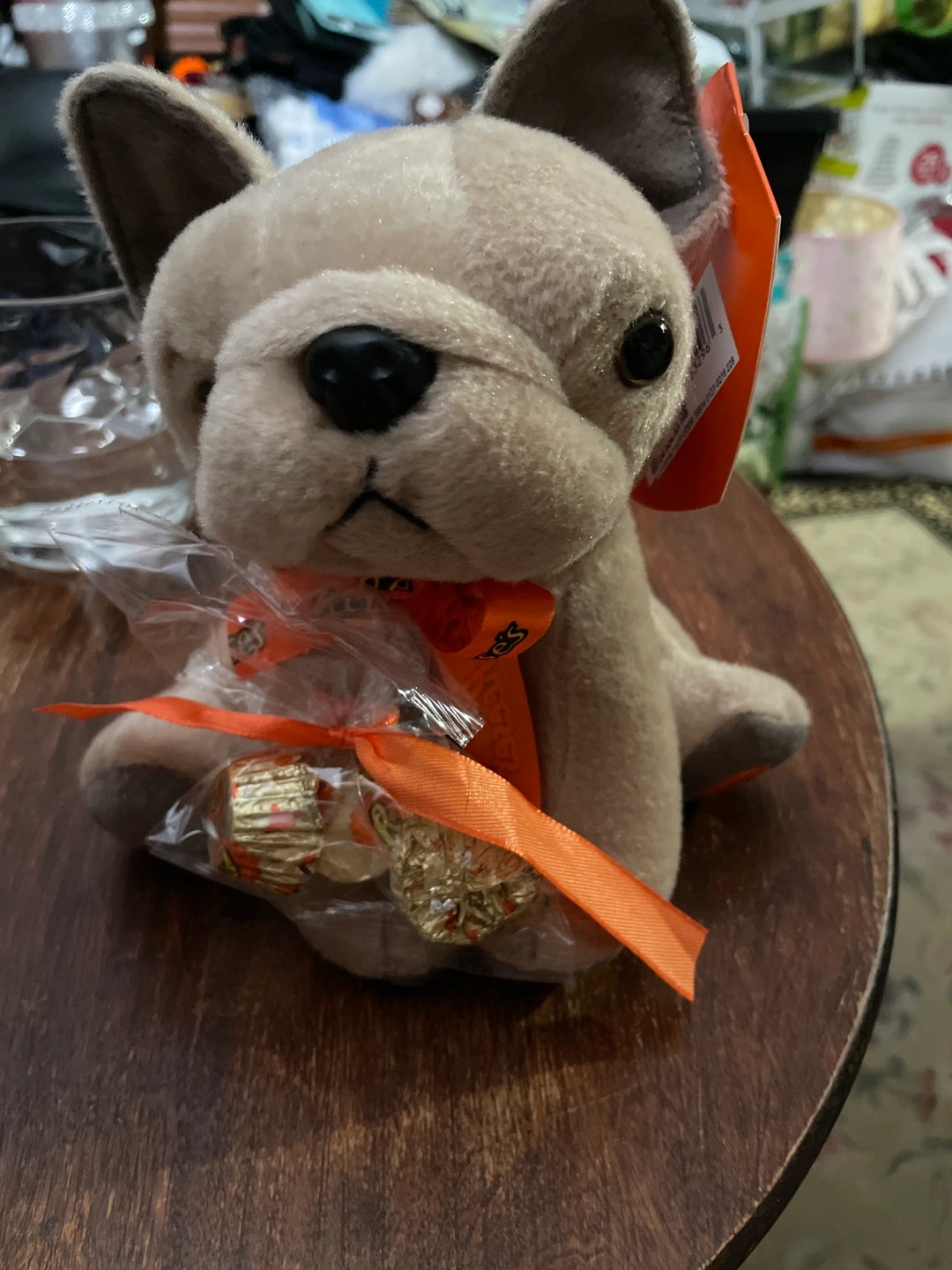 20Reesesās Plush toy with an orange ribbon, holding chocolates.