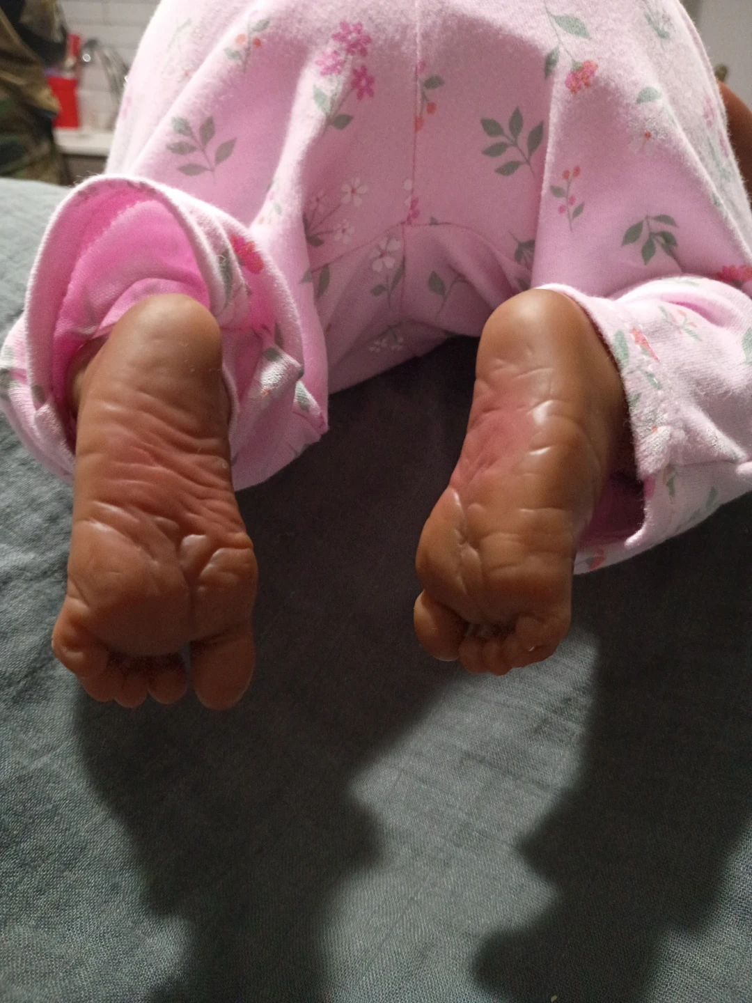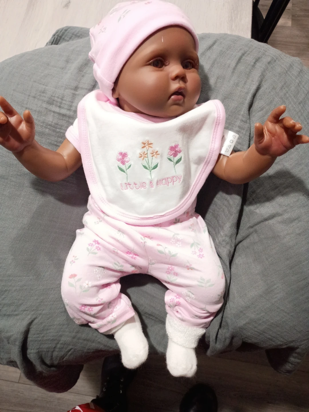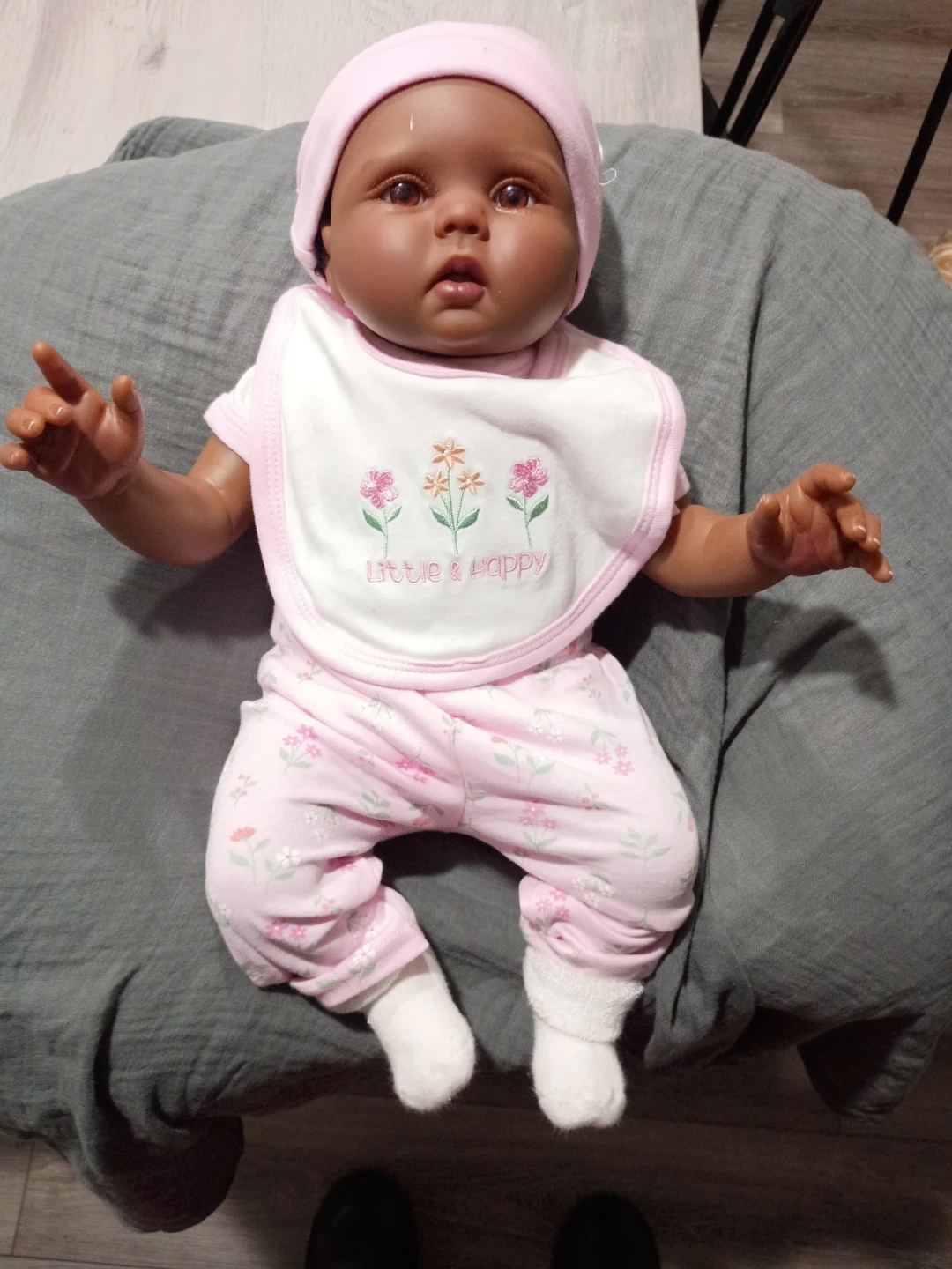 This is a lifelike reborn doll dressed in a pink floral outfit with a matching hat and bib. It includes a baby doll with realistic features and dark curly hair. She was painted and waited by me she weighs about 8 pounds and fits and zero three months clothing she can also fit in some newborn it could be a he or she gender neutral I just chose girl 115 or best to offer she can come with extra stuff for extra charge I can also do a box opening so just let me know