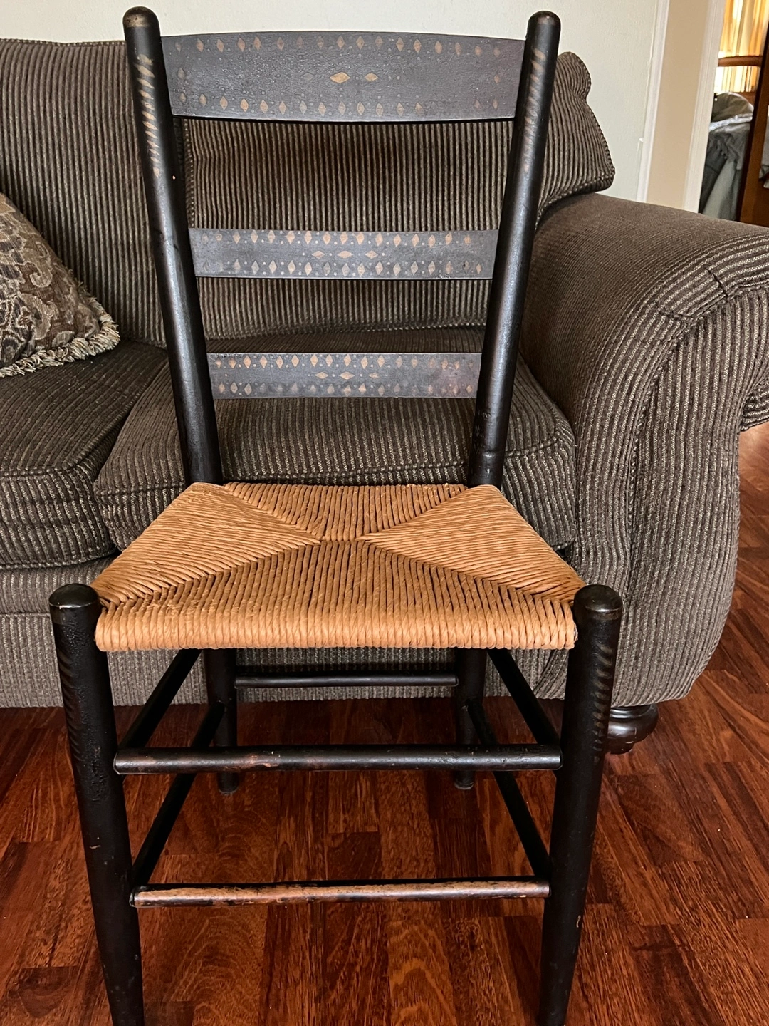 Black Ladderback chairs with a woven cane seat and decorative gold stencil. Great for extra seating for the holidays! These are smaller than regular Ladderback chairs (42”+) making them ideal for younger or more petite guests.