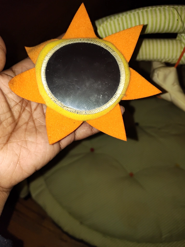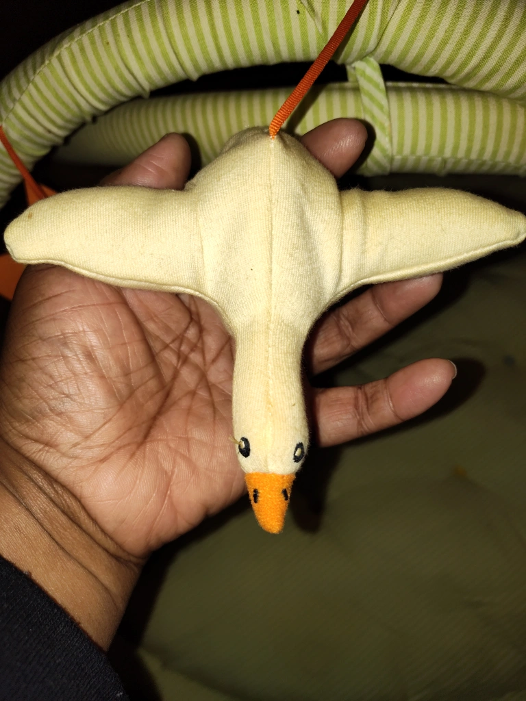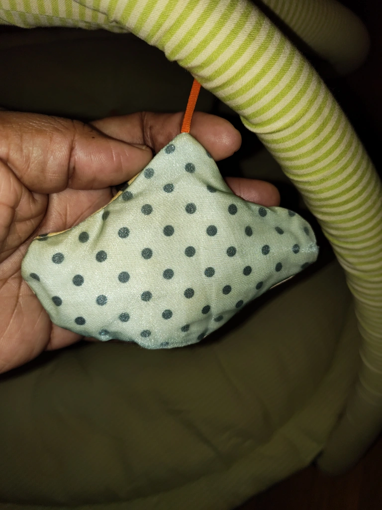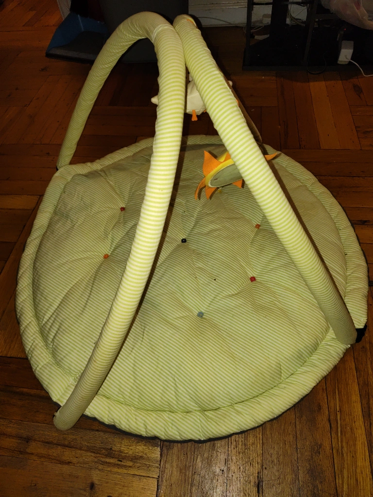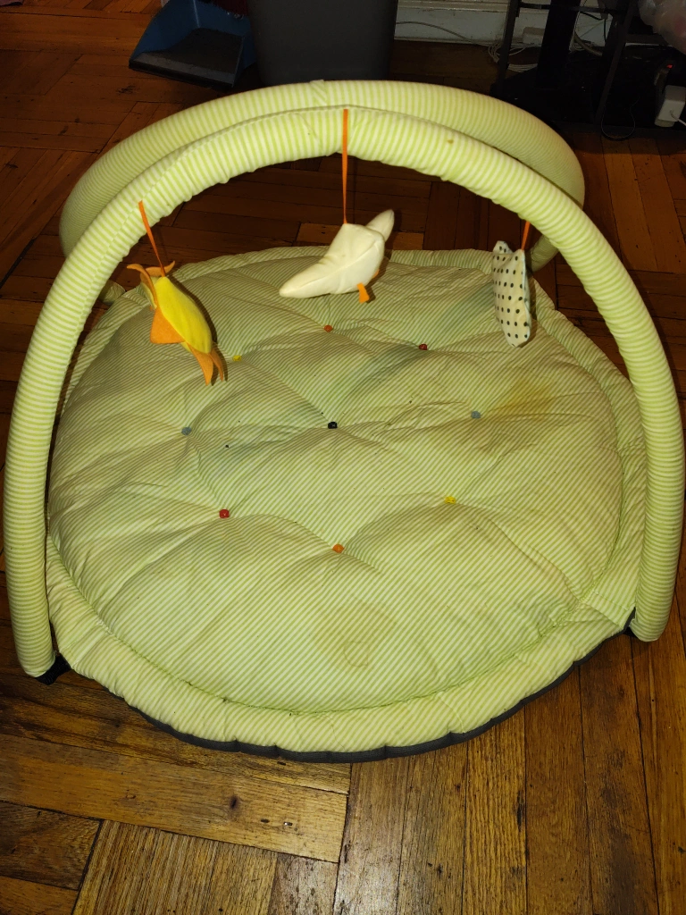 135Green and white striped play mat with arch and hanging toys. Includes a bird, star, and a polka dot toy.