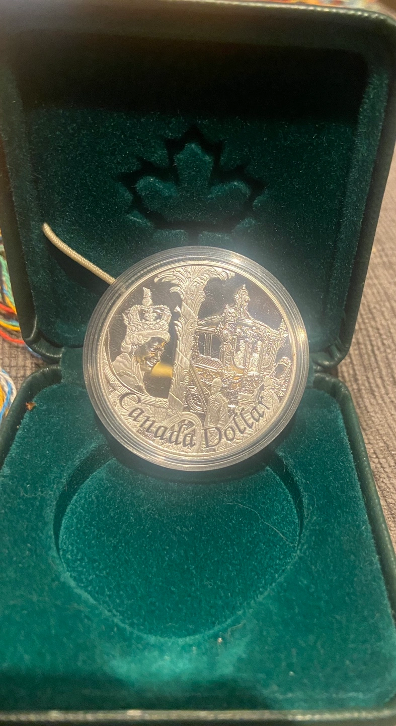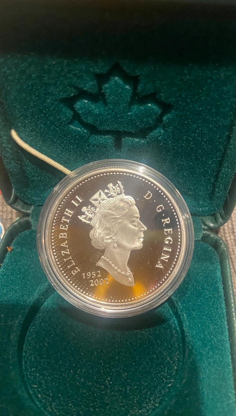 Silver dollar proof coin in original box. Features Queen Elizabeth II Golden Jubilee profile and the Royal Canadian Coat of Arms.