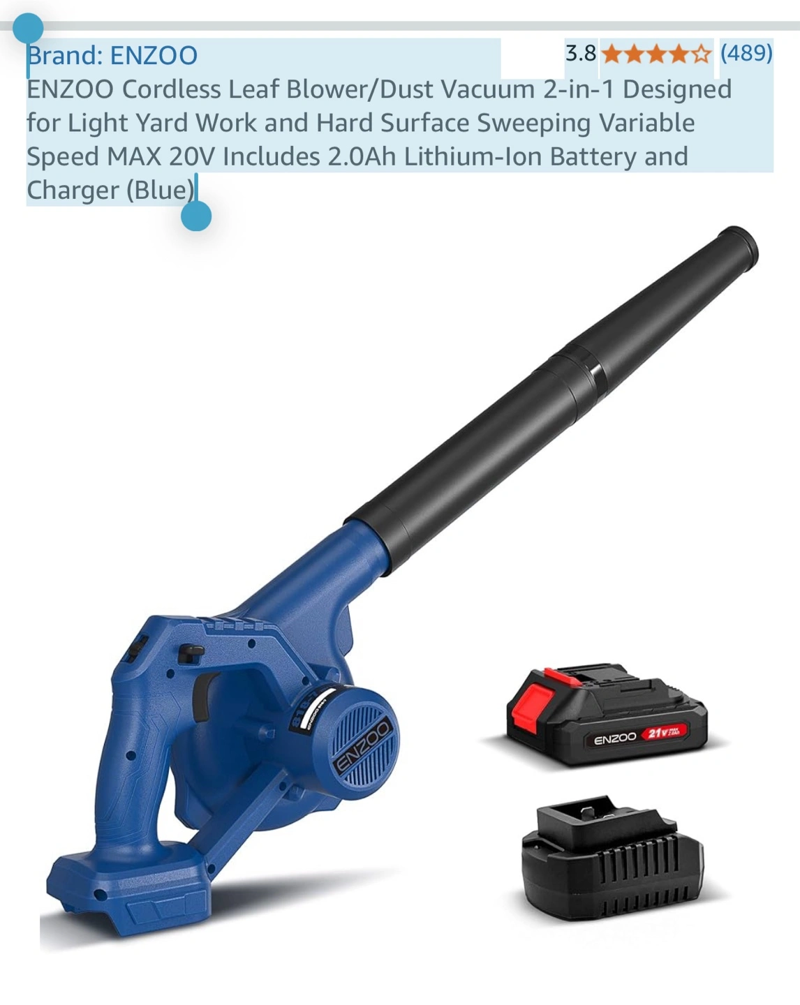 I'm selling an ENZOO cordless leaf blower and dust vacuum. It's a 2-in-1 design perfect for light yard work and hard surface sweeping.