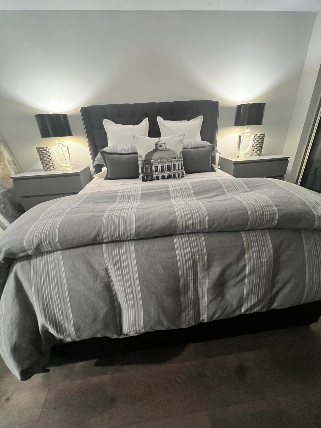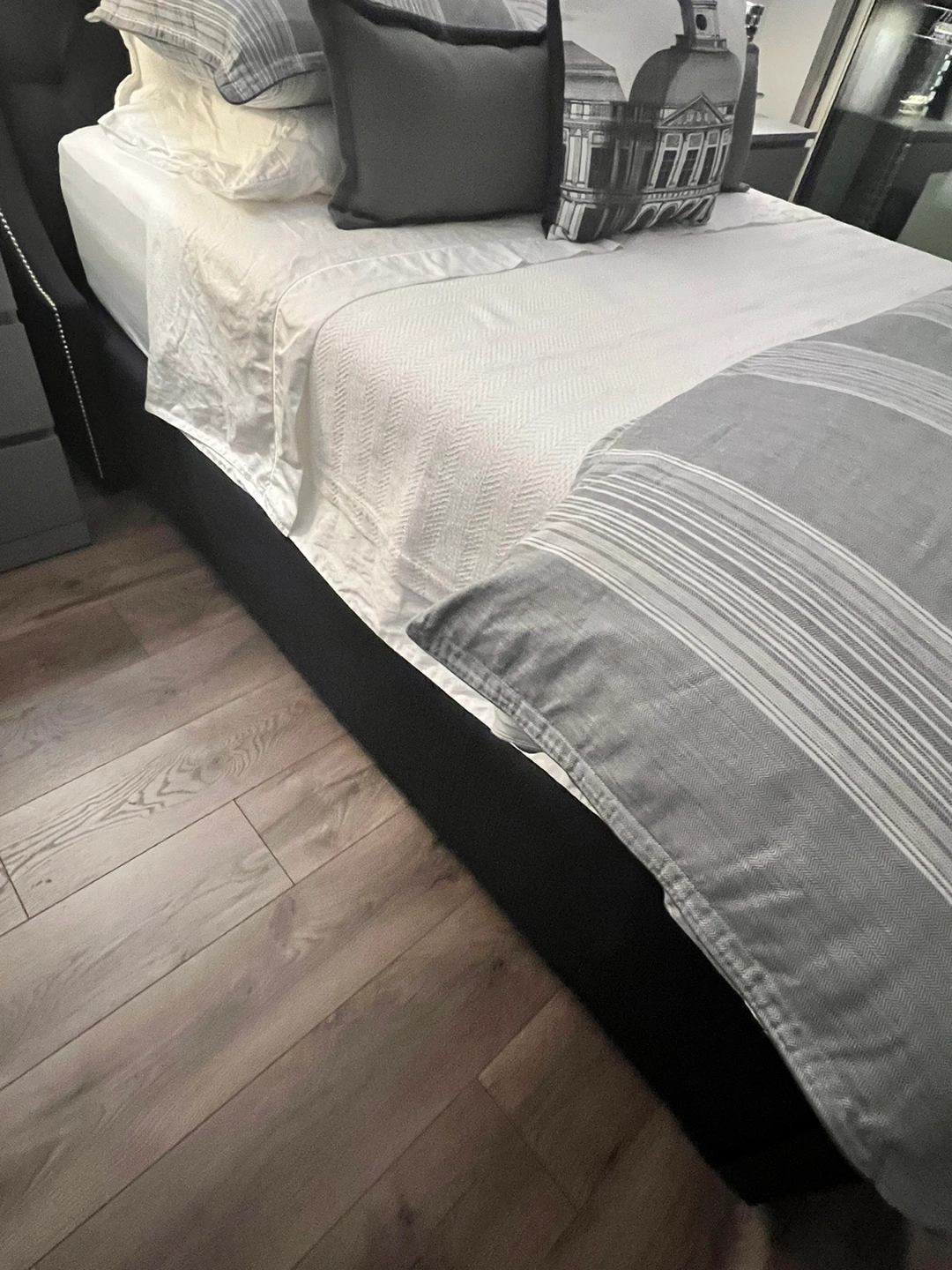 UPHOLSTERED IN A BEAUTIFUL BLACK LINEN LIKE FABRIC, THIS BED COMES FROM A NON SMOKING HOME AND WAS ONLY USED ON A FEW OCCASIONS FOR GUESTS. ORIGINALLY PURCHASED FOR $2000.