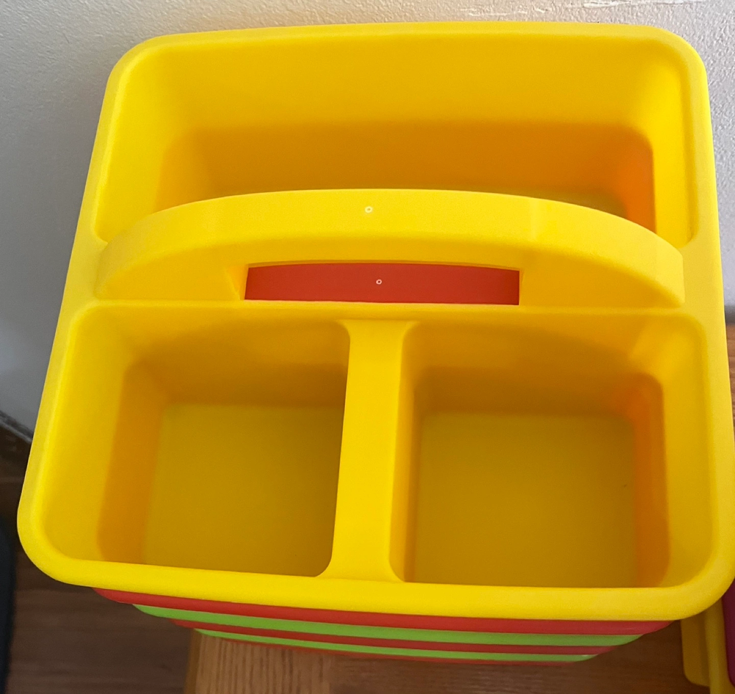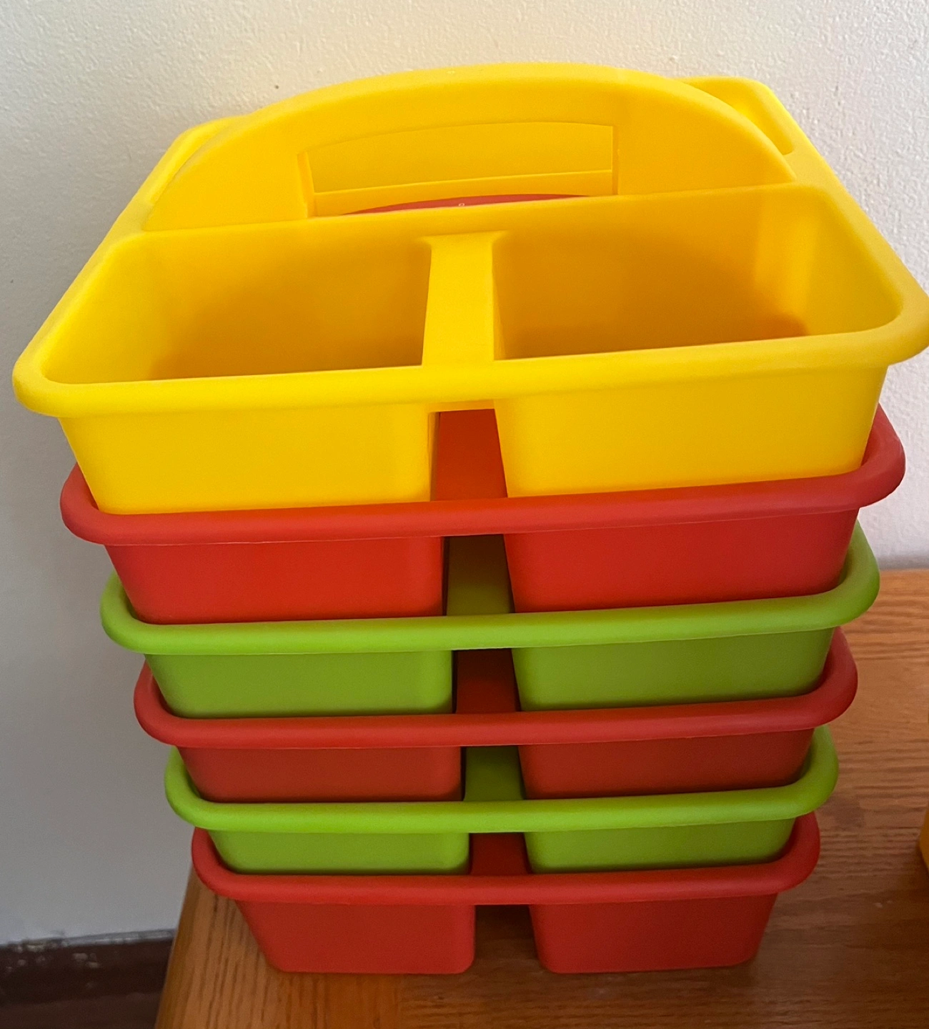 73Set of 6colorful stackable storage bins. Each bin has a handle and compartments. Perfect for organizing office supplies, crafts, or other small items. Take all for $10.