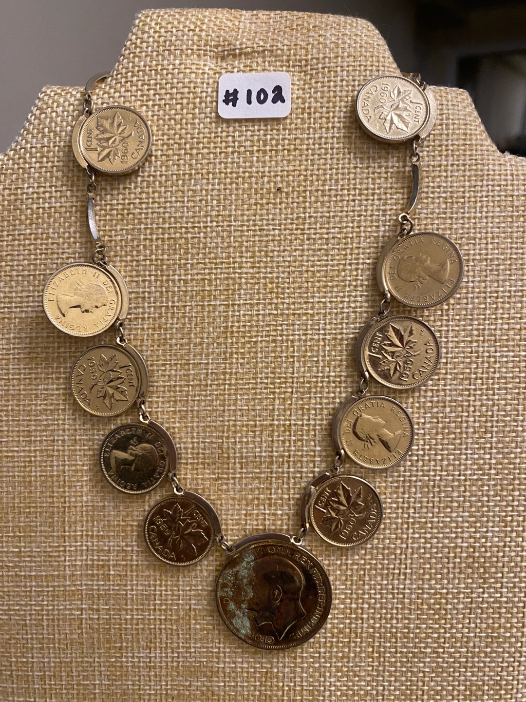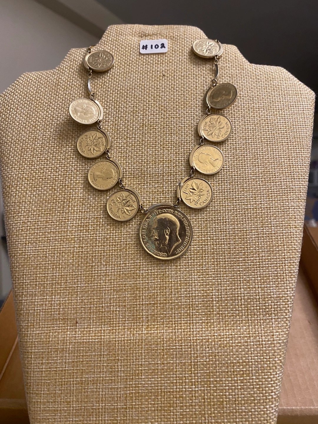 209Gold tone necklace with various coins, featuring a large center coin with a picture of a man's face. The necklace features several different coins.