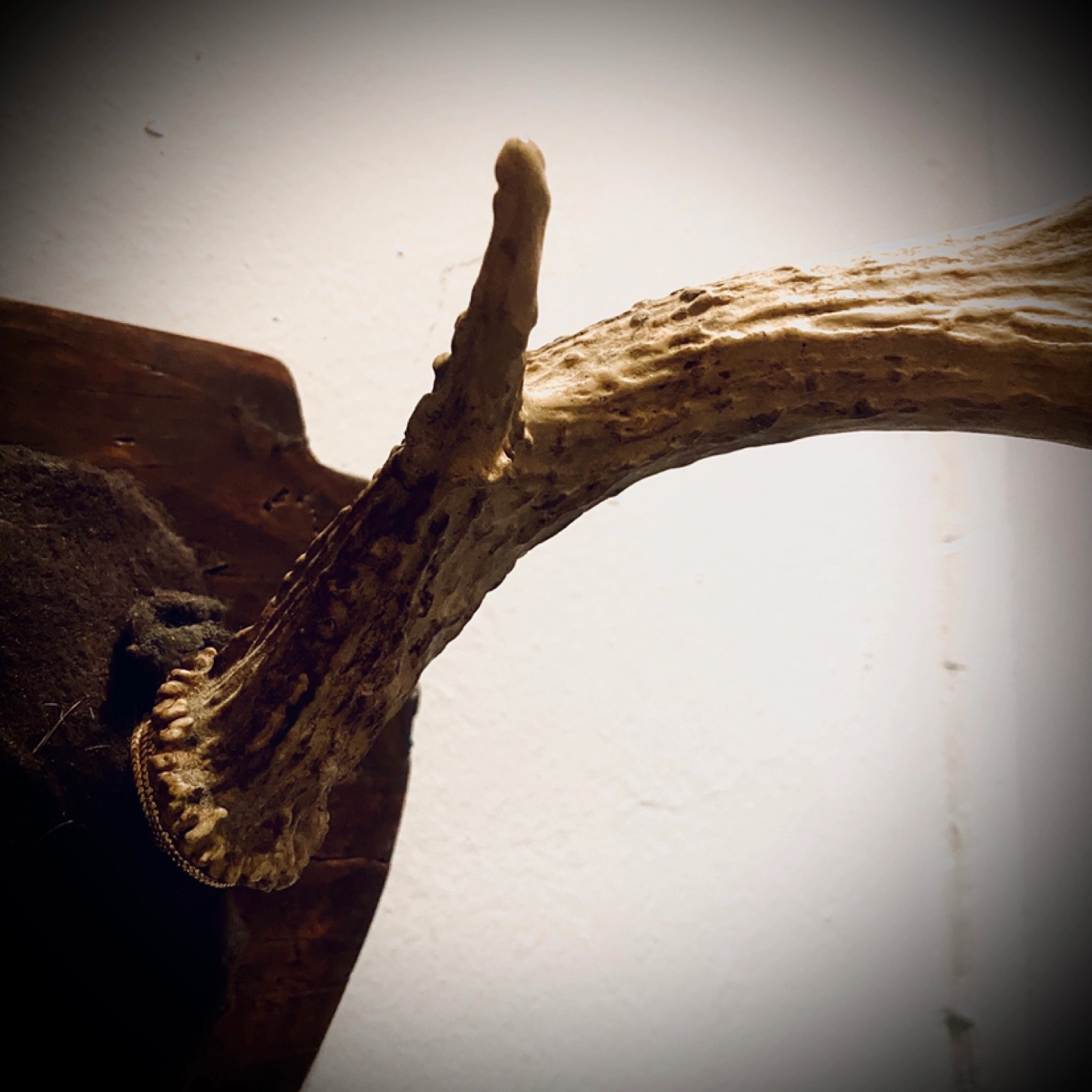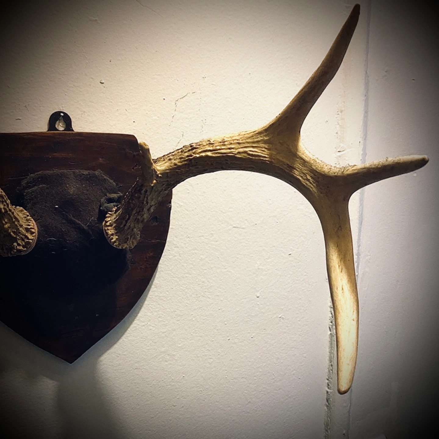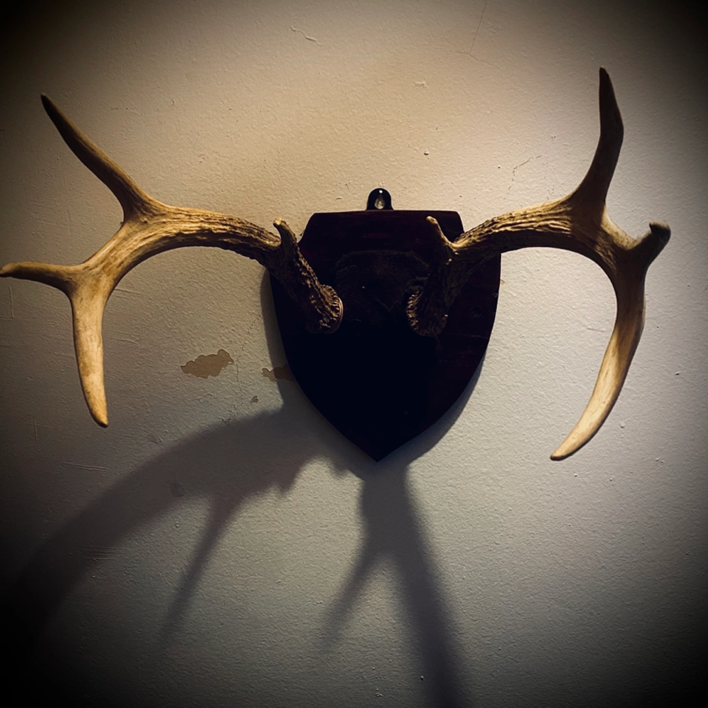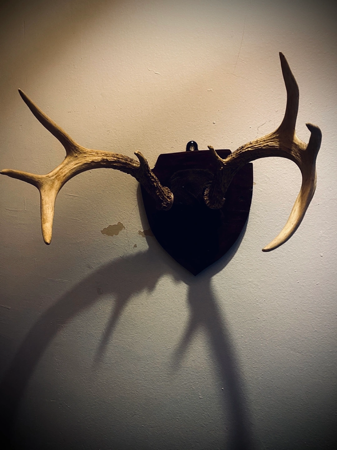 Mounted deer antlers. Wooden plaque with brown velvet backing. Eight points. Very cool piece!