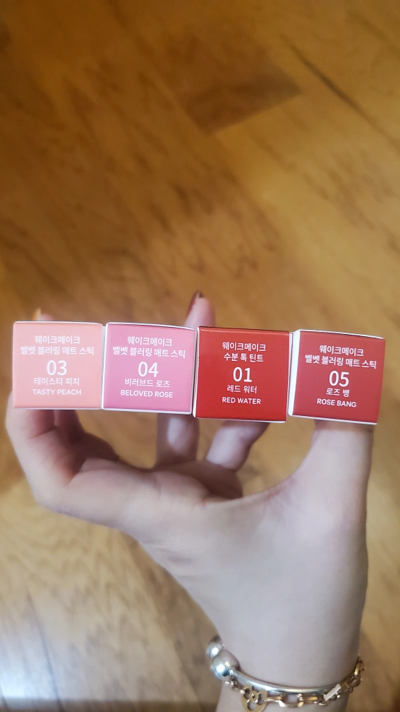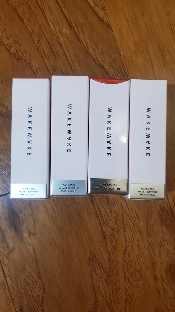393Four shades of Wakemake Velvet Blurring Matte Stick. Shades include: Tasty Peach, Beloved Rose, Red Water, and Rose Bang.