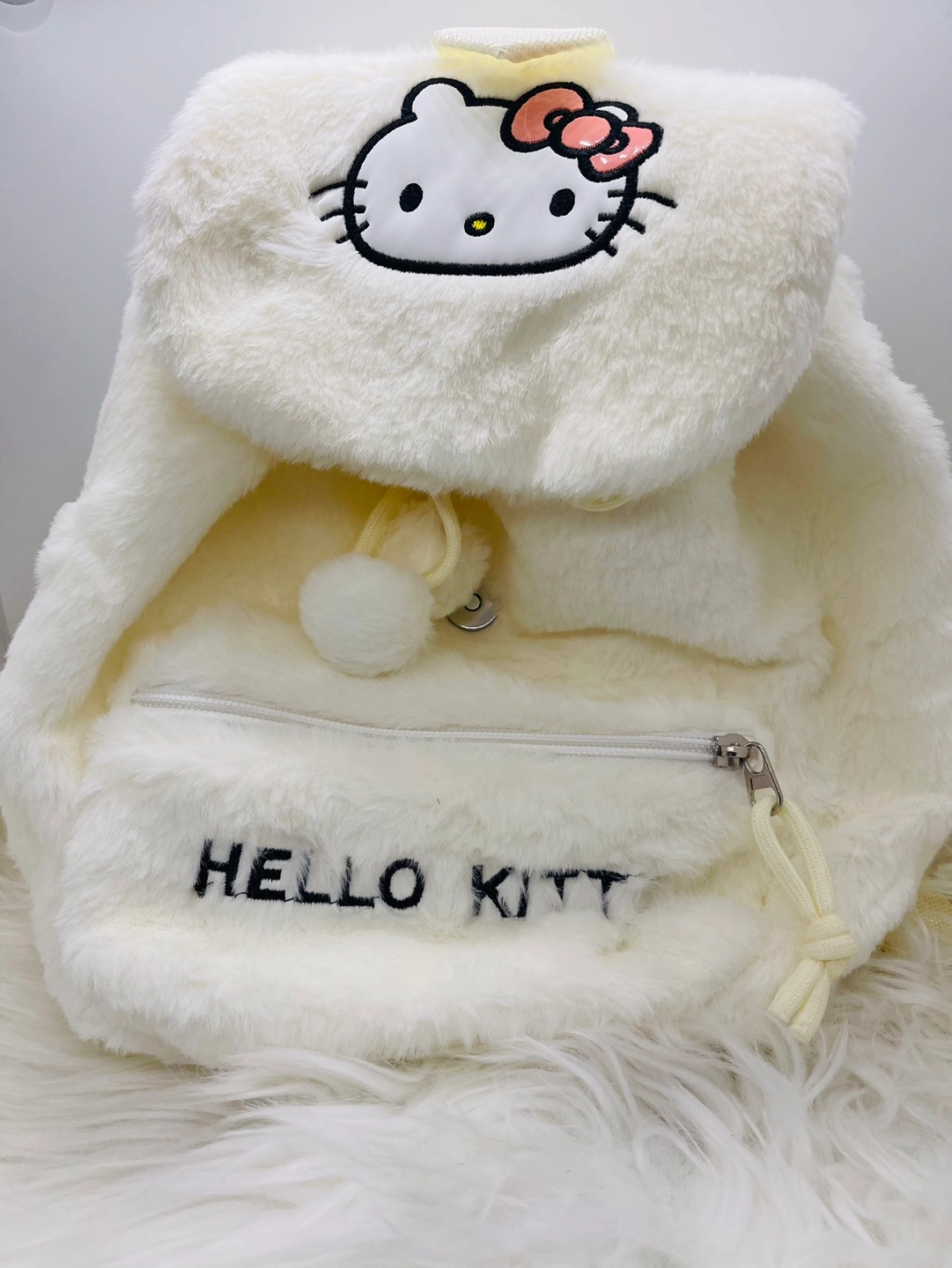Super Cute and Soft White Hello Kitty backpack. Features a fuzzy exterior with embroidered Hello Kitty face and bow. Drawstring closure and zipper closure on the front. Interior is lined with white fabric.