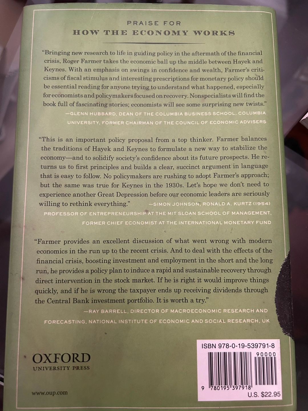 Paperback book, cover shows a bear and a bull, by Roger E.A. Farmer, published by Oxford University Press. Purchased price: $22.95 Selling: $14