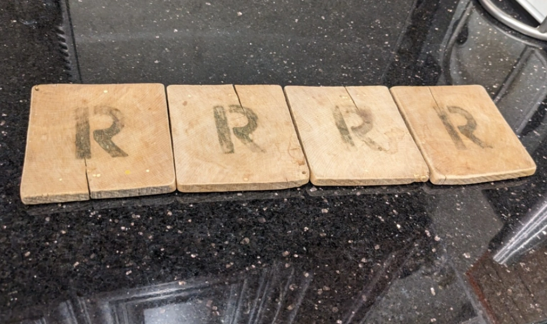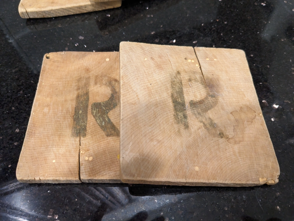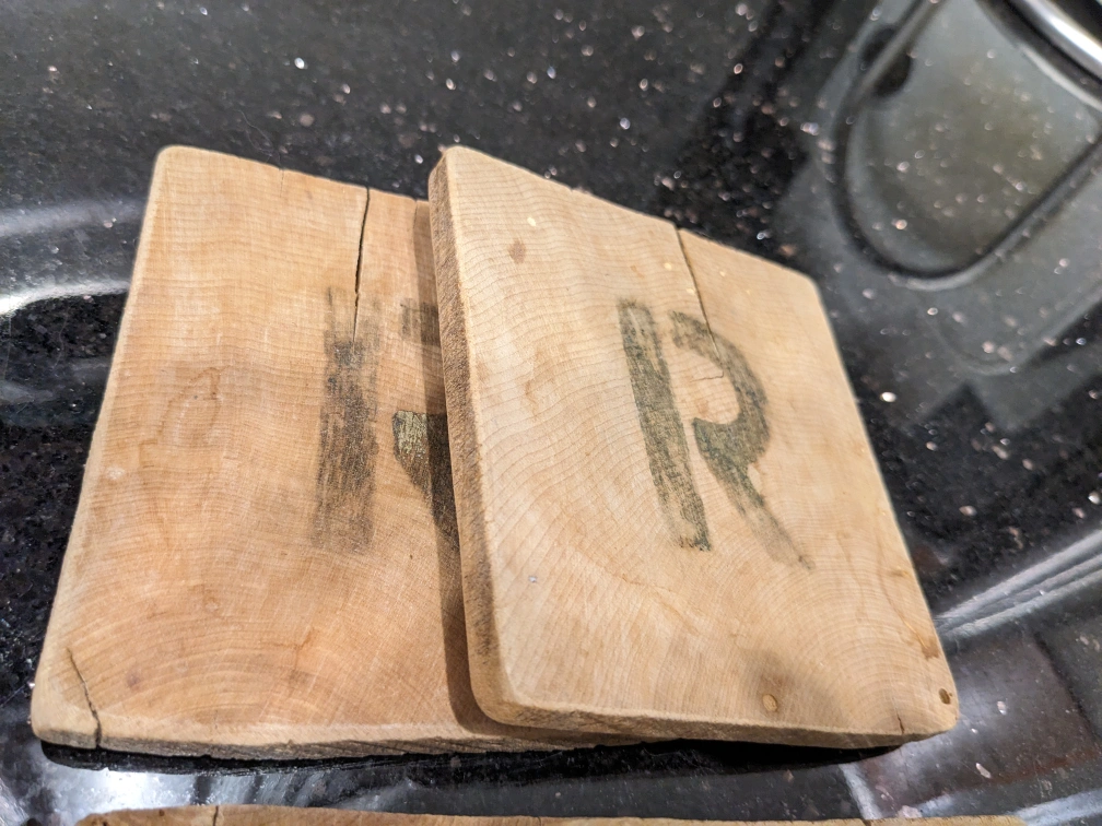 893Reclaimed wood coasters initial R 4 pcs Pick up/Cash only Thanks