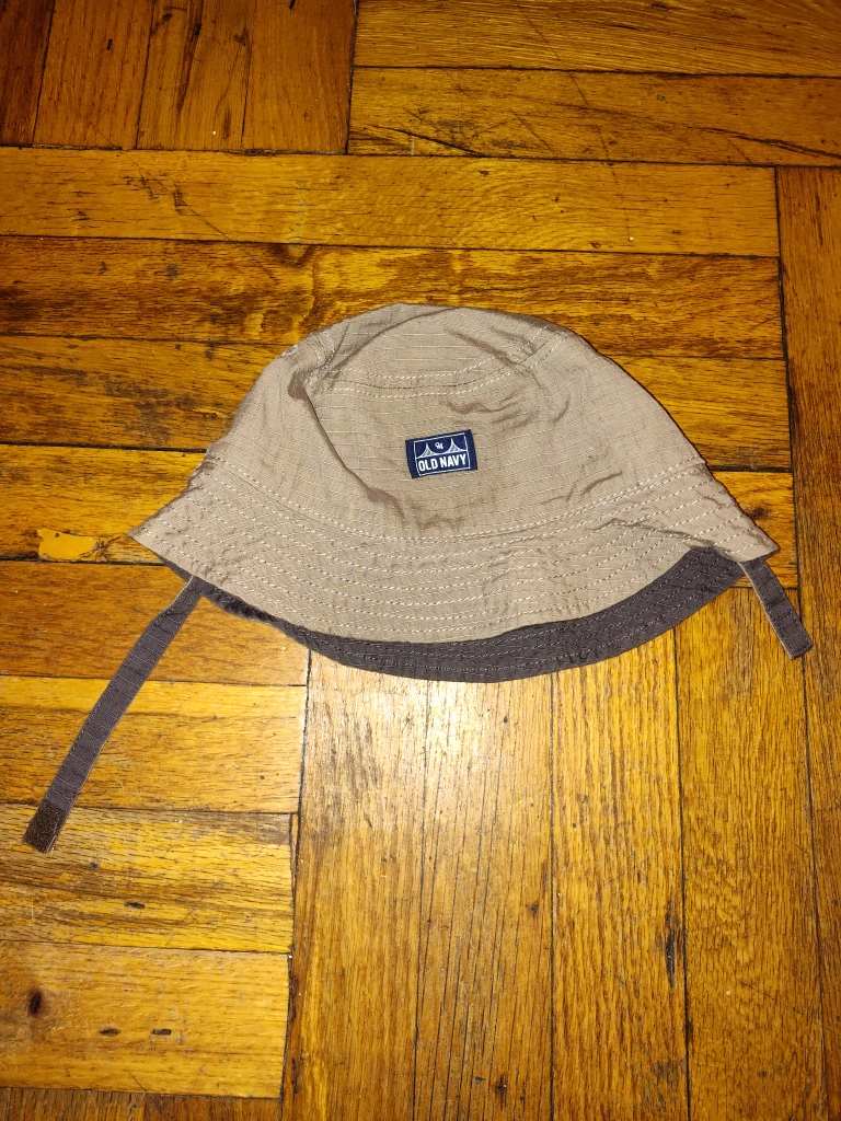135Beige bucket hat with black trim. Adjustable strap.